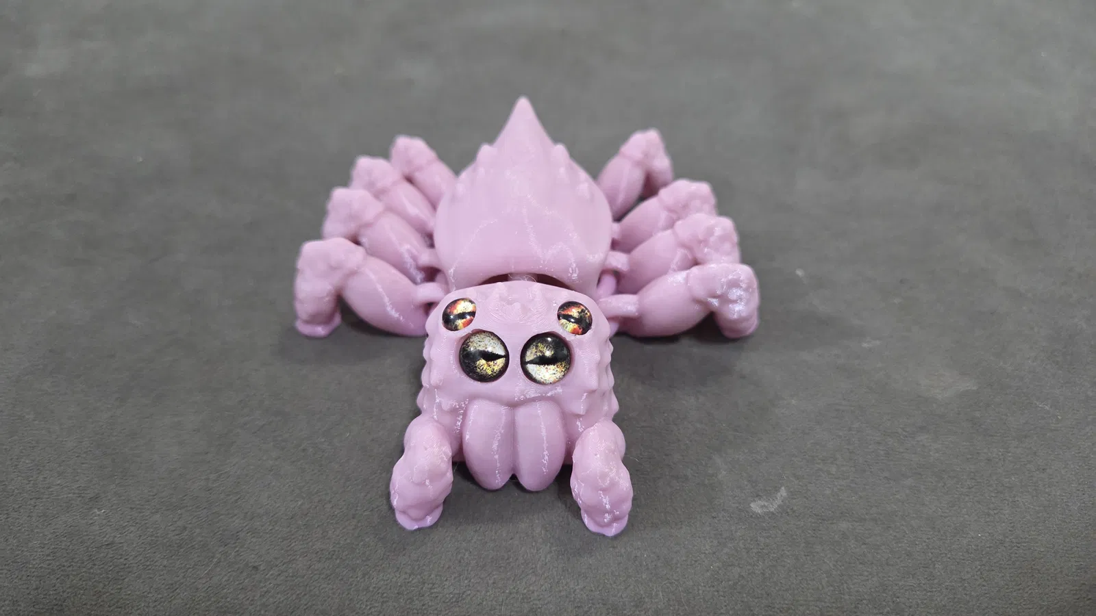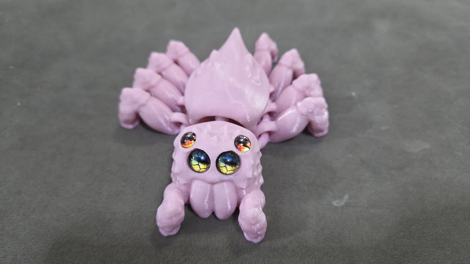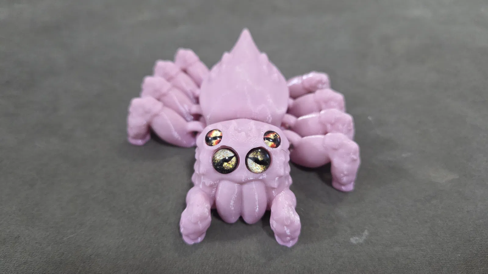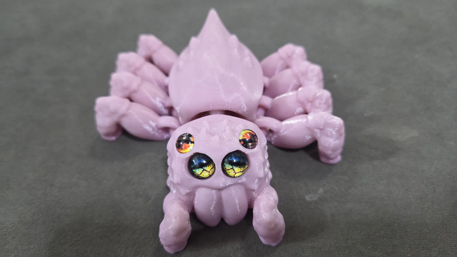 Mẫu Articulated Jumping Spider của Daan_ii nay tương thích mắt kính 6mm và 8mm (cần cả hai cỡ). Kèm file 3mf, sau khi slicing sẽ thấy 4 lỗ mắt. In được không cần supports; thêm brim nếu bám bàn yếu.