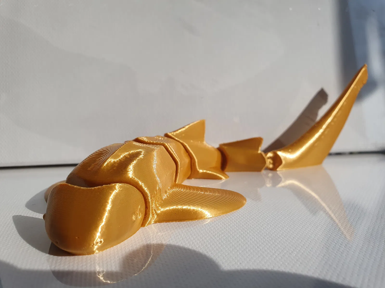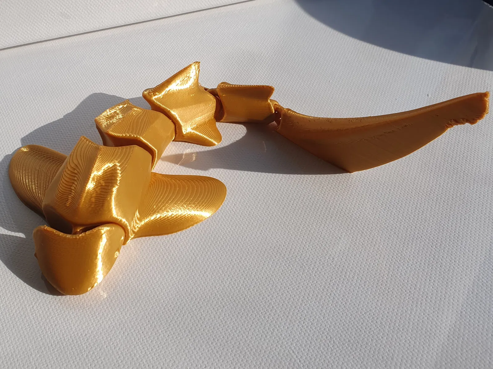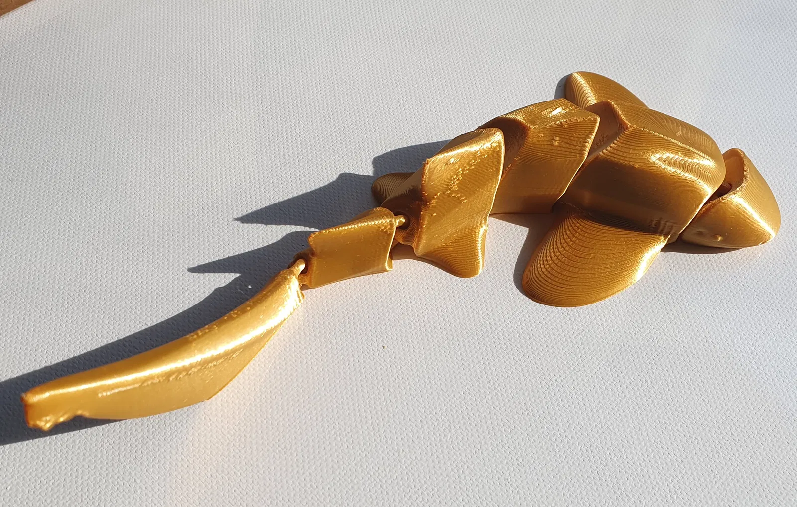 Model là print-in-place và không cần brim hay supports ở bất kỳ chỗ nào. Tuy nhiên mình vẫn gặp vấn đề phần chóp đuôi (tail tip) in không đúng lắm, nhưng với mình vậy cũng ổn. Nếu ai có cách giải quyết thì cho mình biết với. Các khớp (joints) hơi lỏng, có thể mình sẽ làm thêm một phiên bản khác với khớp cải thiện hơn nếu cần.