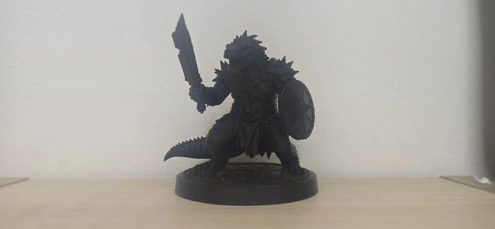 Mẫu figure “Chiến Binh Cá Sấu Đen” phong cách fantasy, cầm kiếm và khiên, giáp đen hầm hố. Phù hợp in 3D làm miniature/collectible, trưng bày hoặc sơn mô hình theo sở thích.