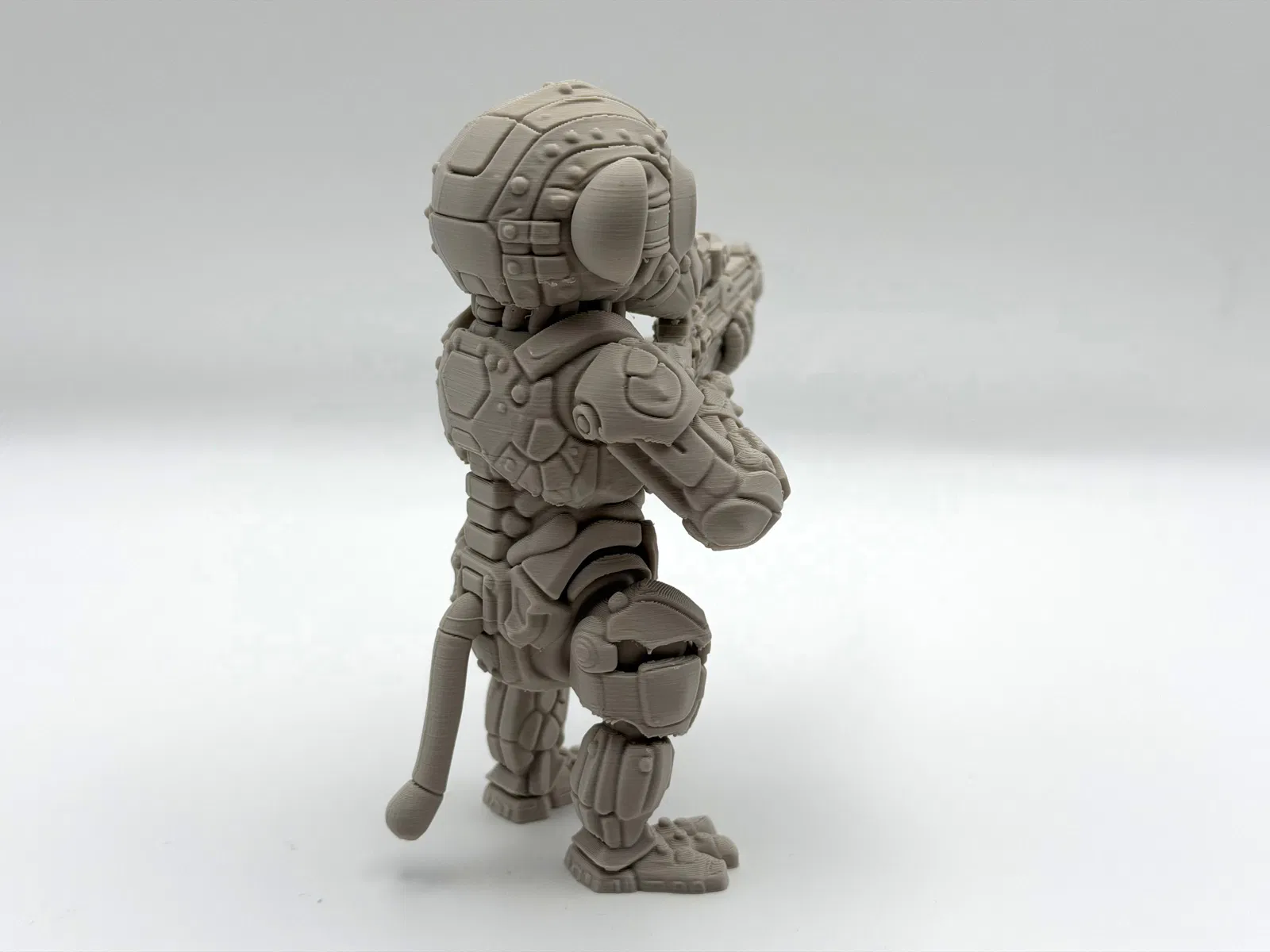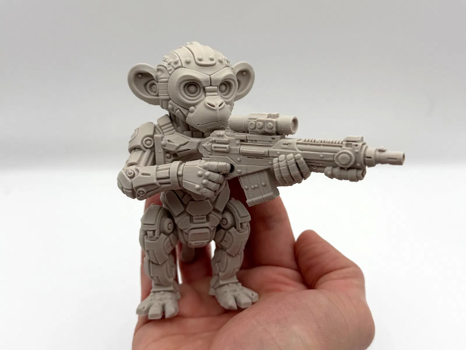 Mechanical Monkey Soldier – chiến binh khỉ cơ khí phong cách sci‑fi, giáp bọc chi tiết, trang bị chiến thuật và khẩu rifle tương lai cầm bằng hai tay. Có dùng supports (organic) để in, dễ bóc tháo hơn khi chỉnh Z-top height.