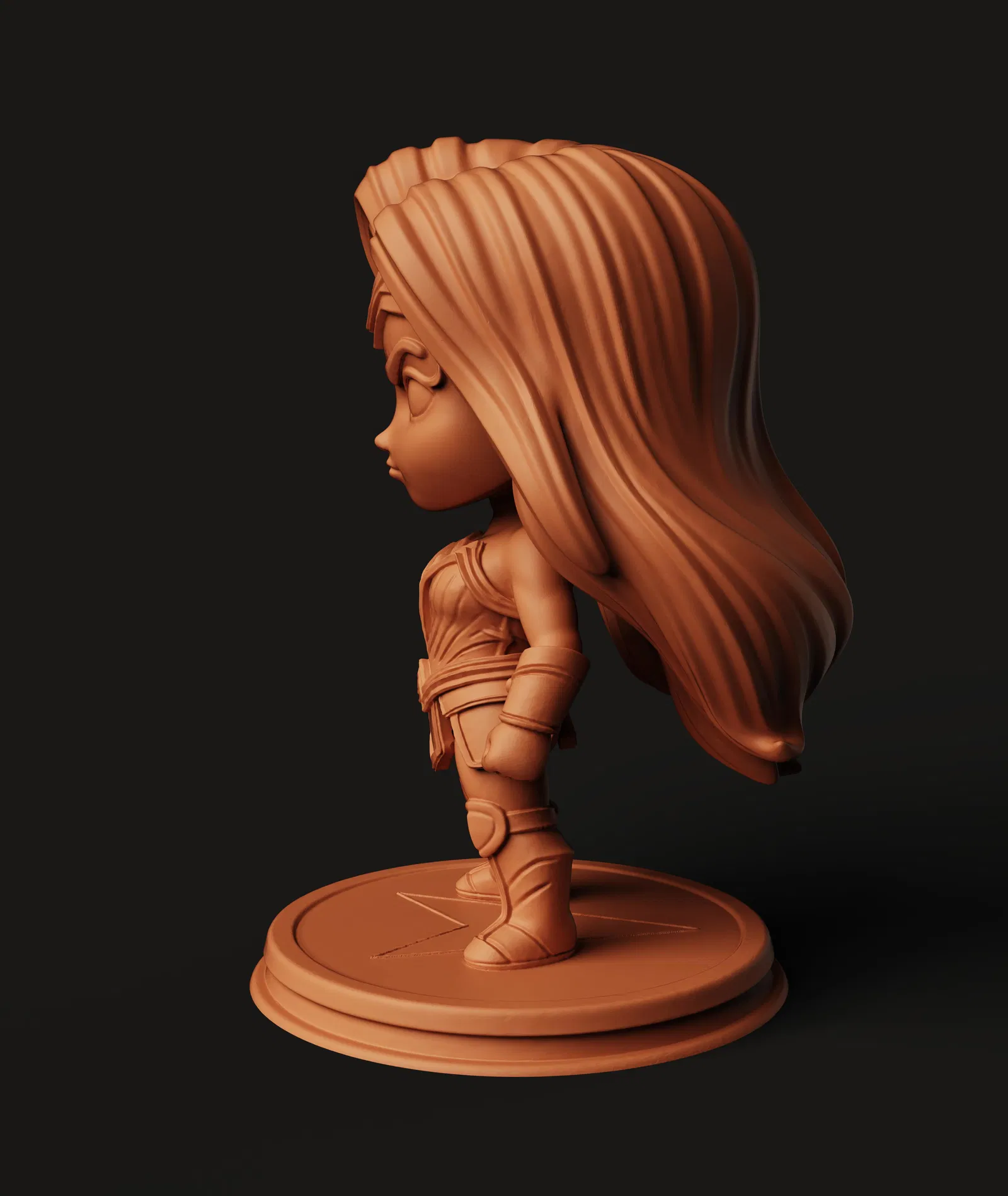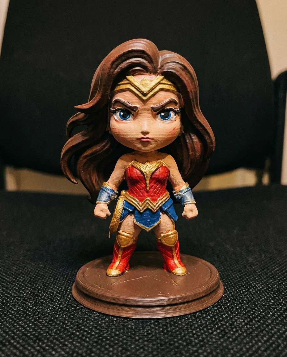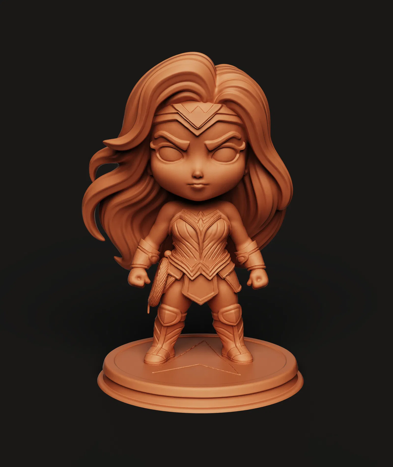 Wonder Woman chibi dễ thương – công chúa Themyscira với tiara và giáp đặc trưng. Hợp cho fan DC Comics, đồ sưu tầm và in 3D. Gợi ý FDM: layer 0.16–0.2mm, infill 10%, 2 walls, Tree/Organic supports.