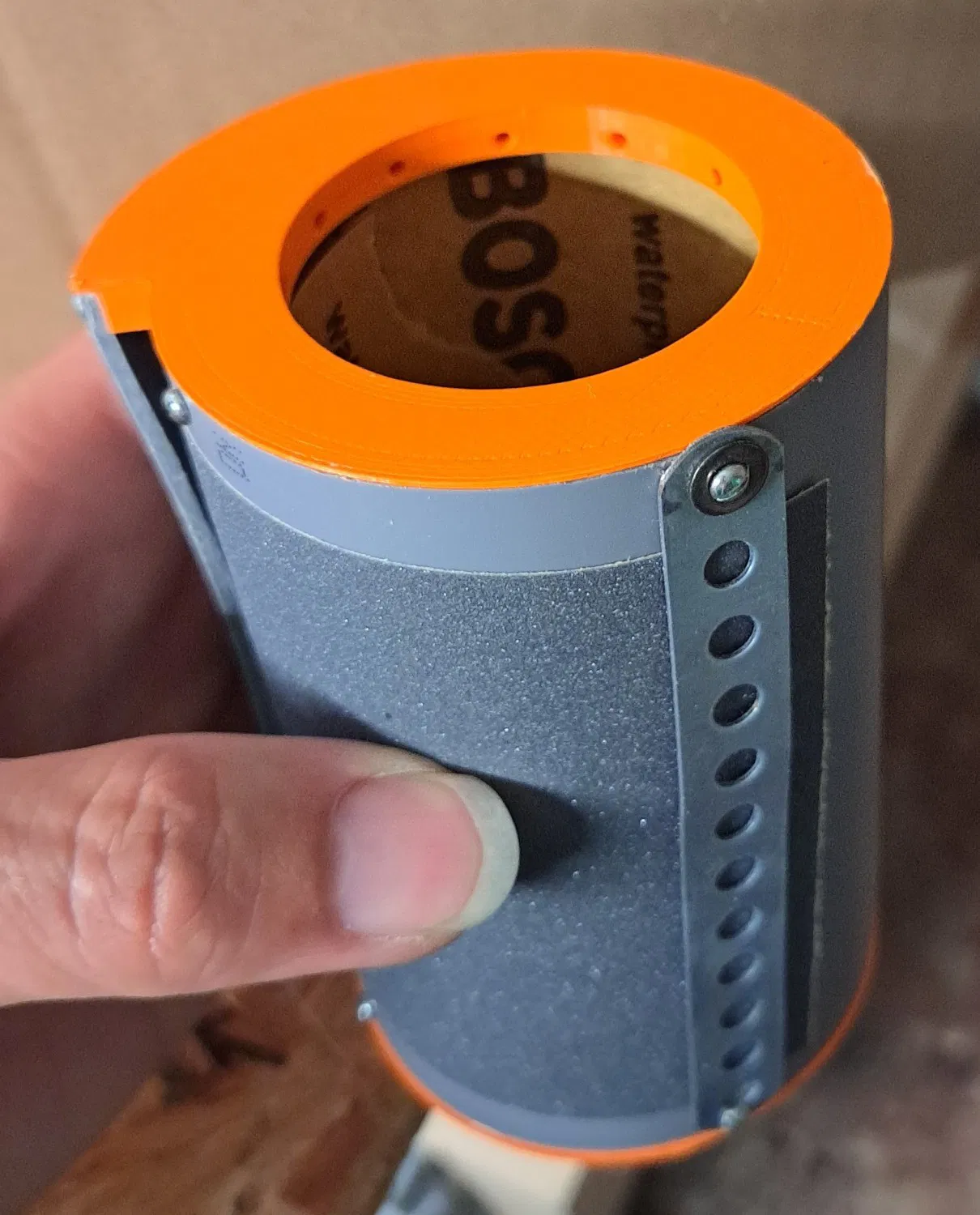 Bạn cần một đường ống DN75 chụp theo chiều rộng của con lăn giấy nhám của bạn và xảy ra chiều dài. Sau đó, ở hai phần bên và vặn lên với các ốc vít 2 mm- vẽ tốt nhất các lỗ trong ống HT từ bên trong bằng một mũi khoan ngắn và sau đó khoan. Một mệnh giá của các ốc vít giữ dải lỗ kim loại, được giữ ở khoảng cách xa với hai chủ sở hữu khoảng cách :)