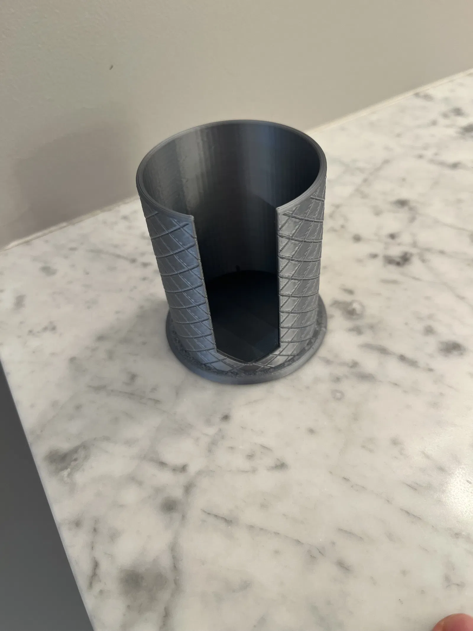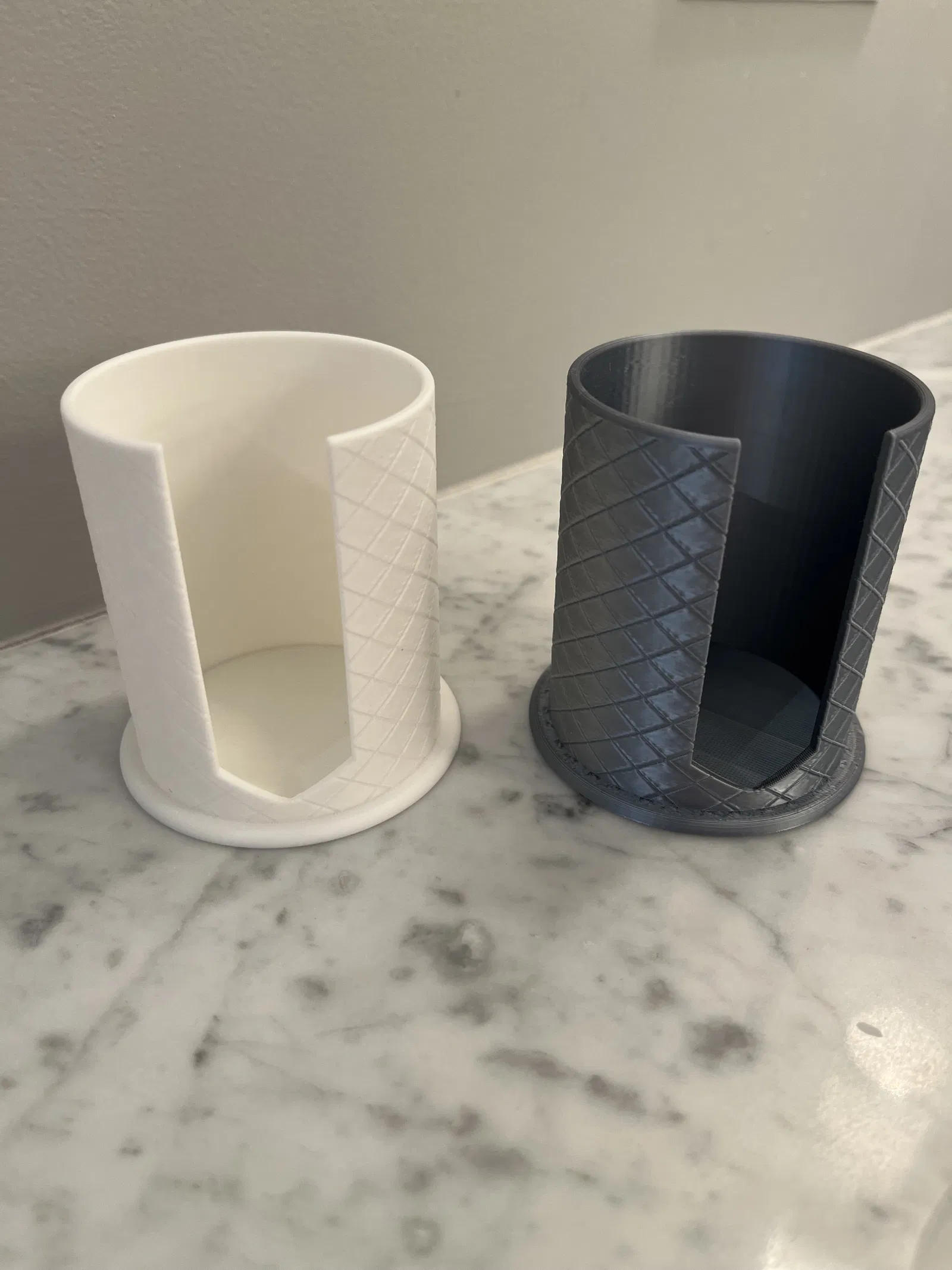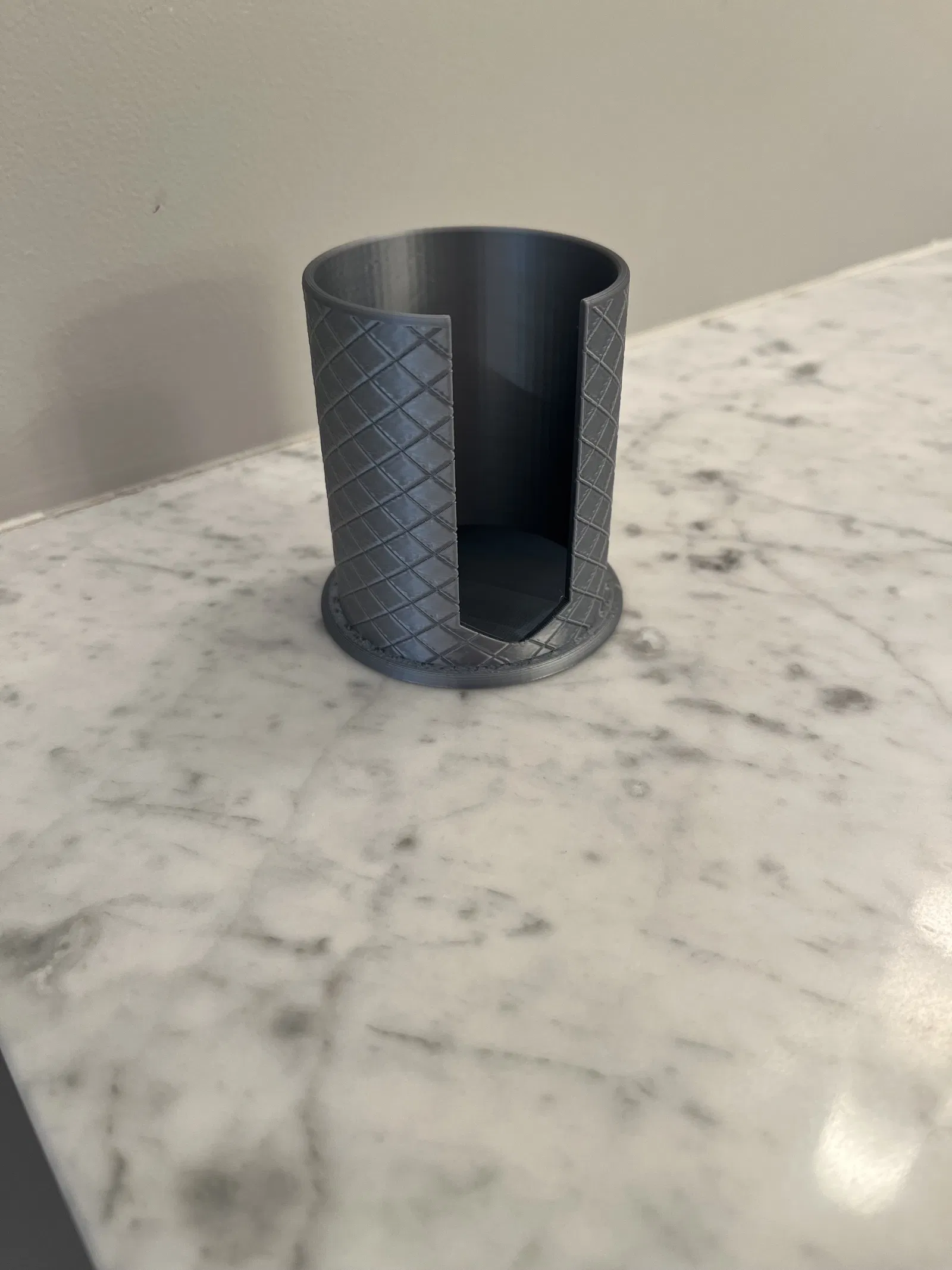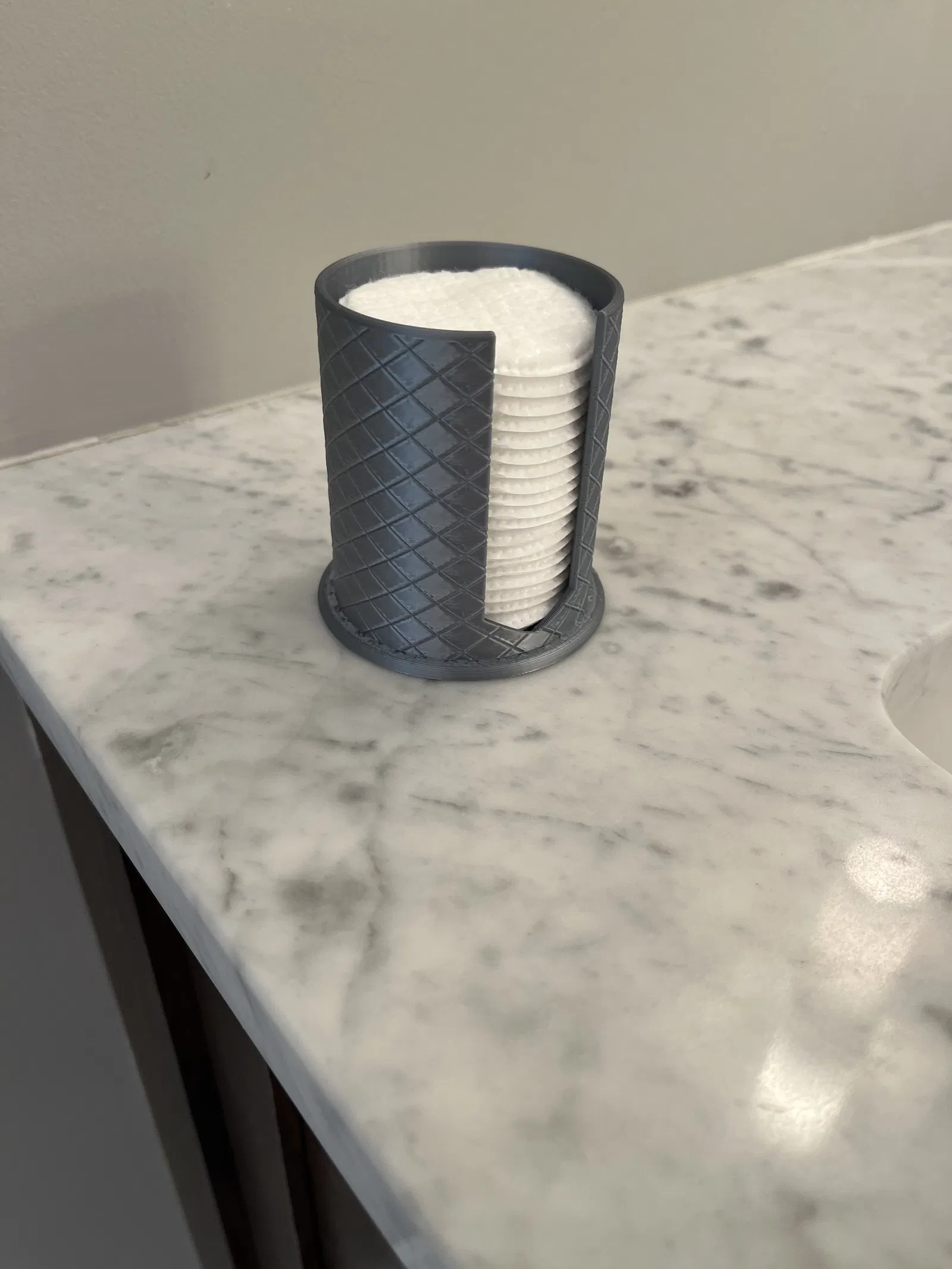 Holder đựng cotton rounds với texture khắc chìm nhìn sang hơn khi để trên countertop. In tốt bằng PLA; filament metallic/satin cho bề mặt đẹp. Gợi ý: nozzle 0.4, layer 0.2, infill 15% (Gyroid).
