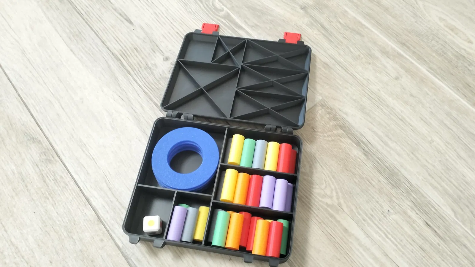 Tower game là trò tháp cân bằng lắc lư cho 2 người: xếp 6 tầng, mỗi tầng 6 ống trụ đủ các màu, lắc xúc xắc rồi rút ống theo màu. Ai làm đổ tháp là thua. Có thêm hộp đựng để cất bộ.
