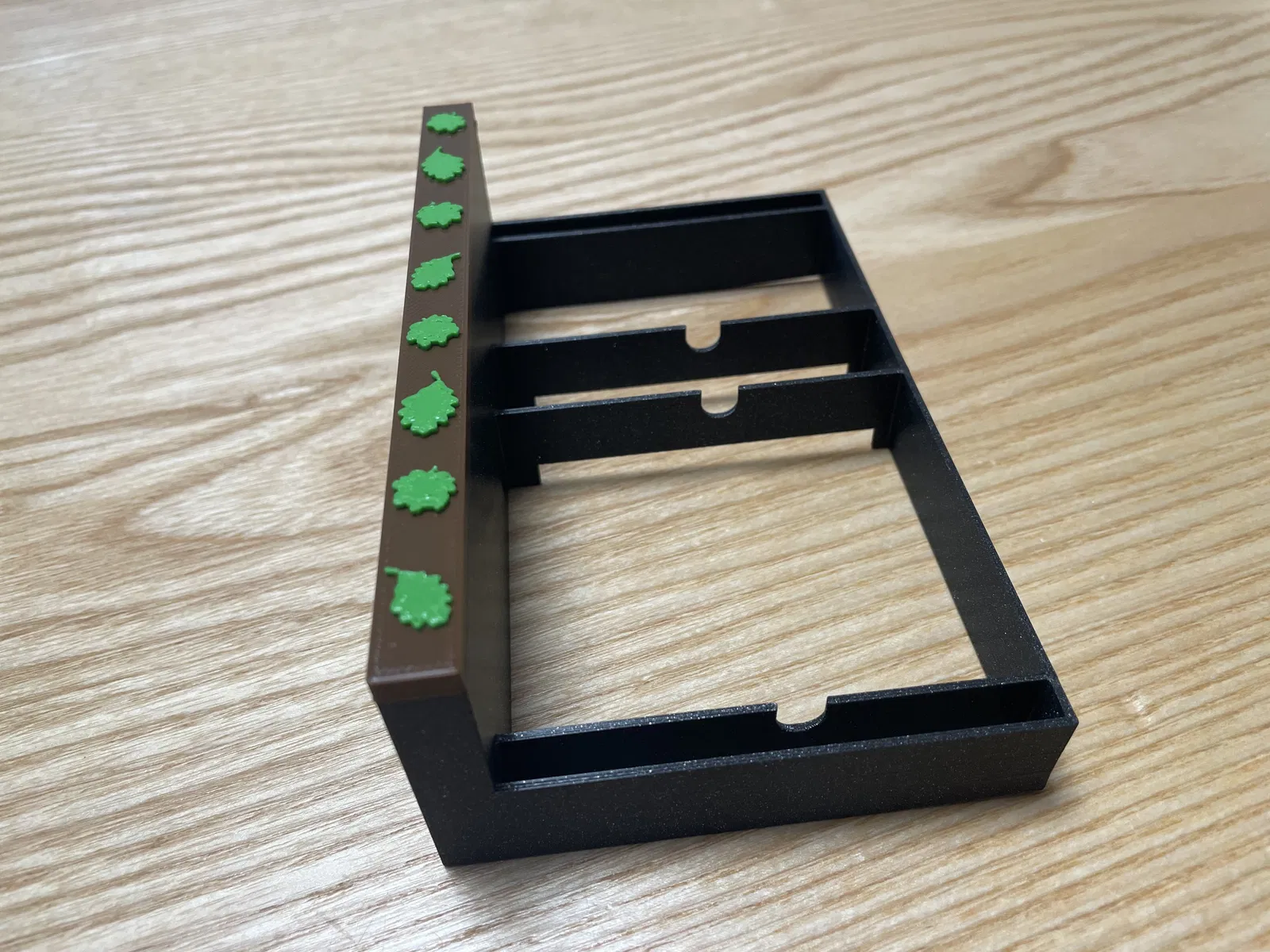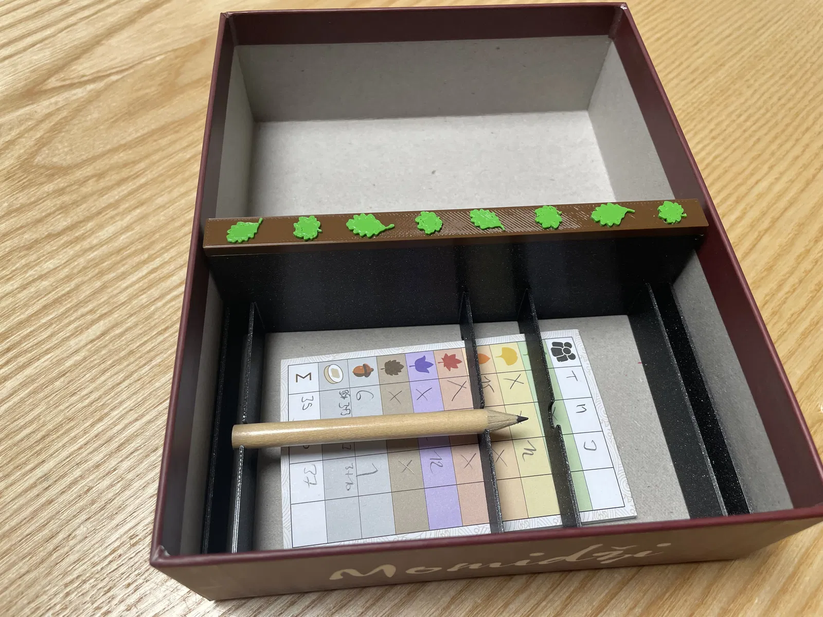 Insert/organiser cho phiên bản tiếng Czech (CZ) của game thẻ bài MOMIJI/MOMIDŽI. Gợi ý in layer 0,2 STRUCTURAL bằng PLA; muốn hiệu ứng nhiều màu thì color change ở 20 lớp cuối và các lớp có lá.
