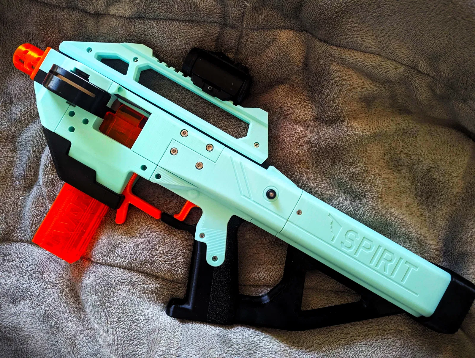 SPIRIT là dart blaster dáng SMG dùng flywheel brushless, chỉnh tốc 0–225 fps, solenoid pusher và 7 chế độ bắn có thể khóa. Có OLED hiển thị pin/đếm đạn, tùy chọn BCAR và các nâng cấp in TPU.