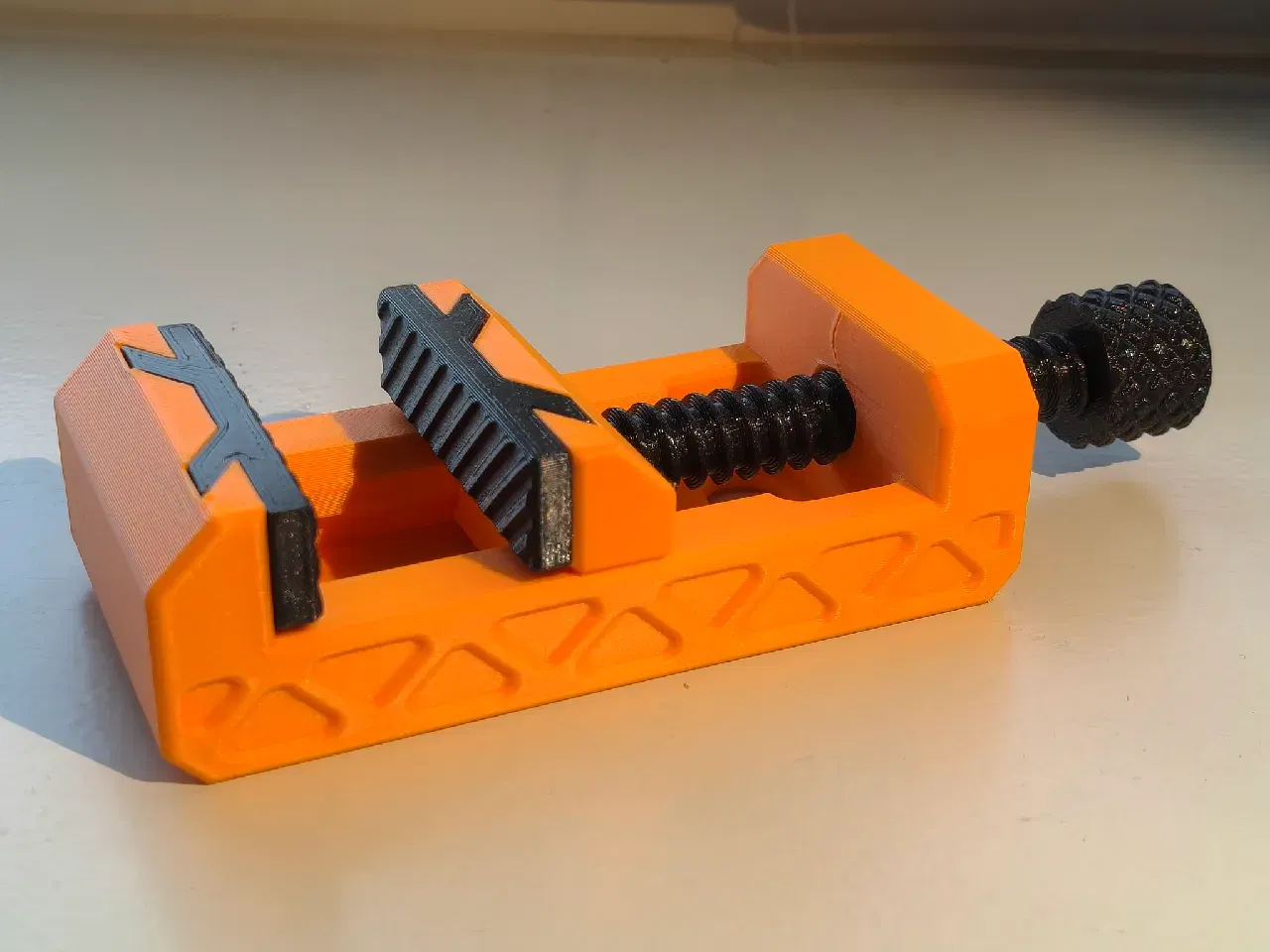 Ê-tô dùng cơ cấu vít đơn giản mà chắc chắn, và được tối ưu để in không cần support, ngoại trừ phần clamp.