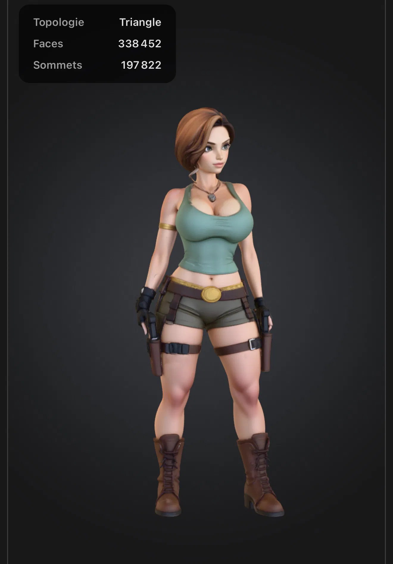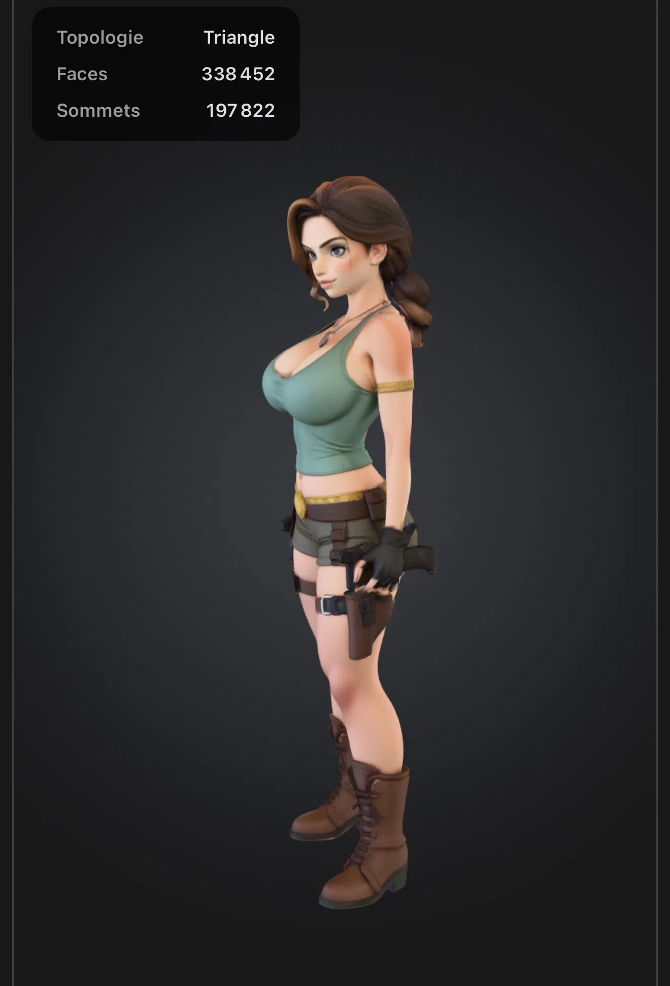 Figurine “Aventurières des ruines” khắc họa nữ aventurière hiện đại, dáng đứng tự nhiên, trang bị chi tiết, hợp in trang trí hoặc sơn. File STL, topo Triangle, ~338k faces; khuyến nghị in PLA/PLA+ với layer mỏng và supports tùy hướng.
