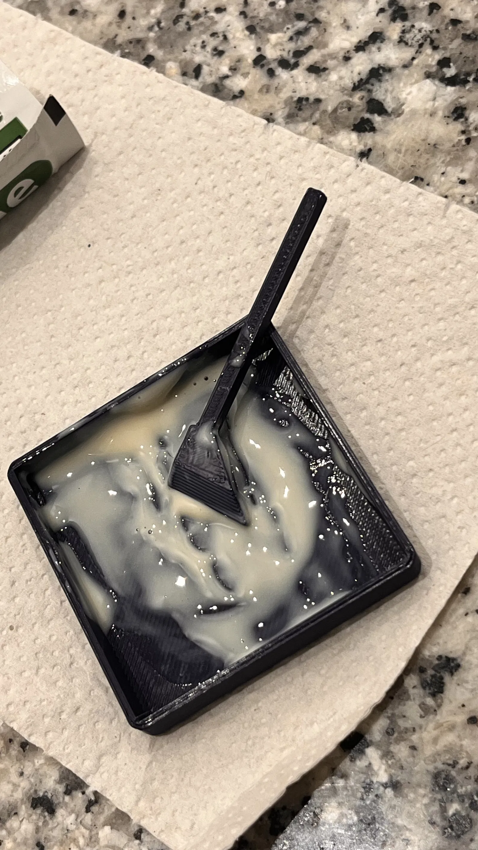 Khay trộn keo 2 thành phần dùng một lần cho epoxy hoặc urethane. Que trộn gắn sẵn trên khay, bẻ ra dễ, có cạnh sắc để châm keo vào lỗ nhỏ. Phù hợp để tận dụng hết cuộn filament còn dư.