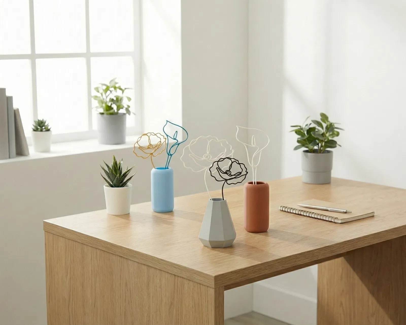 Tổng quan 💡 Bộ này gồm hai loài hoa biểu tượng: Poppy mảnh mai và Calla Lily thanh lịch. Các mẫu được thiết kế để trở thành những bông hoa “bền mãi”. Nhờ profile phẳng hoàn hảo và không có phần đế dày cộm, sản phẩm cho cảm giác gọn gàng, cao cấp, giống phong cách wire sculpture của đồ decor thiết kế. Rất hợp để cắm vào bình cổ nhỏ, điểm xuyết chậu cây trong nhà, hoặc thêm hiệu ứng 3D cho hộp quà và phong bì. 🎨