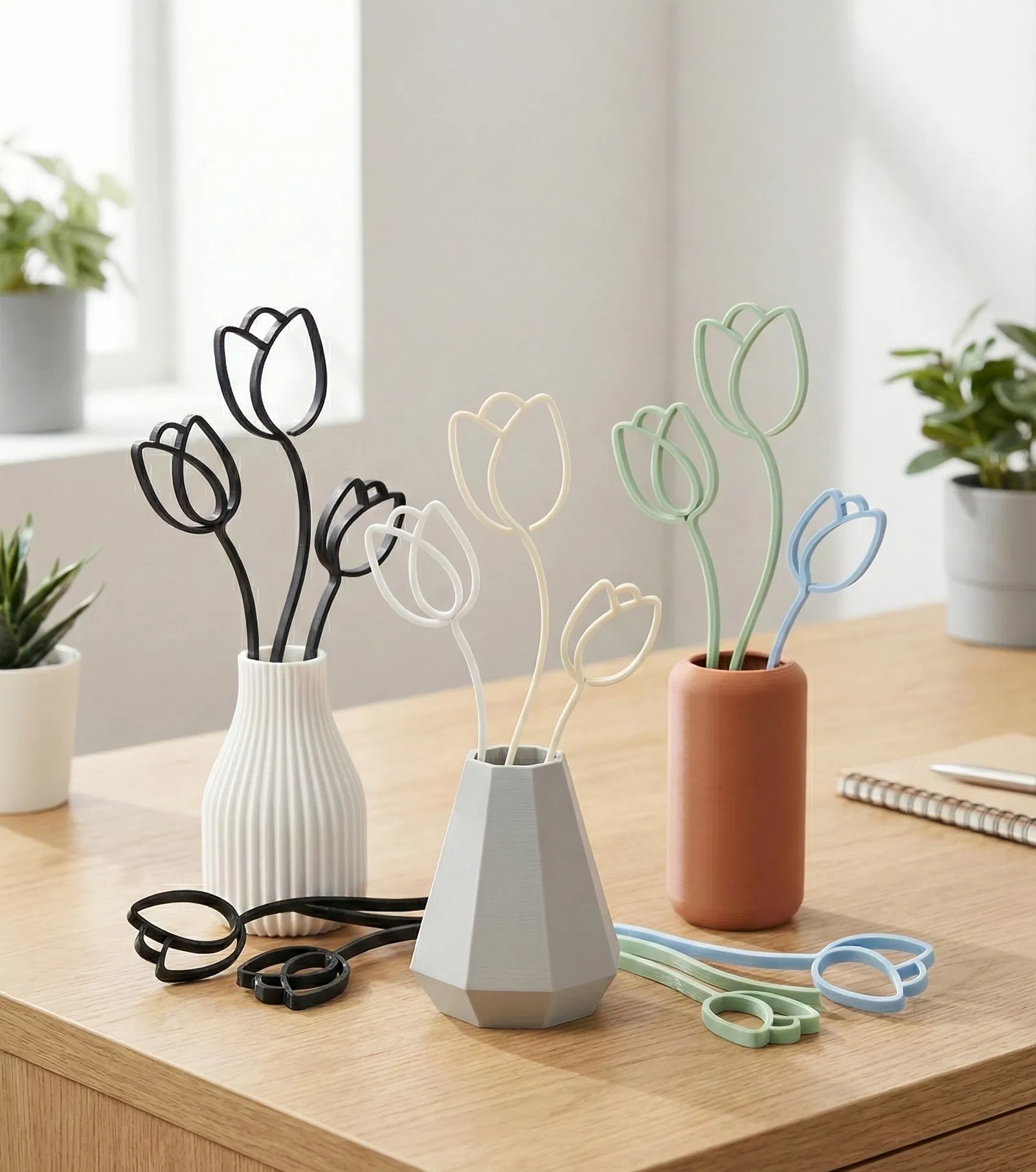 Bộ 3 silhouette tulip tối giản với đường nét thanh lịch, dùng trang trí bình hoa, chậu cây hoặc gói quà. In dễ, không cần supports, hợp PLA/PETG/Matte; tạo điểm nhấn hiện đại cho mọi không gian.