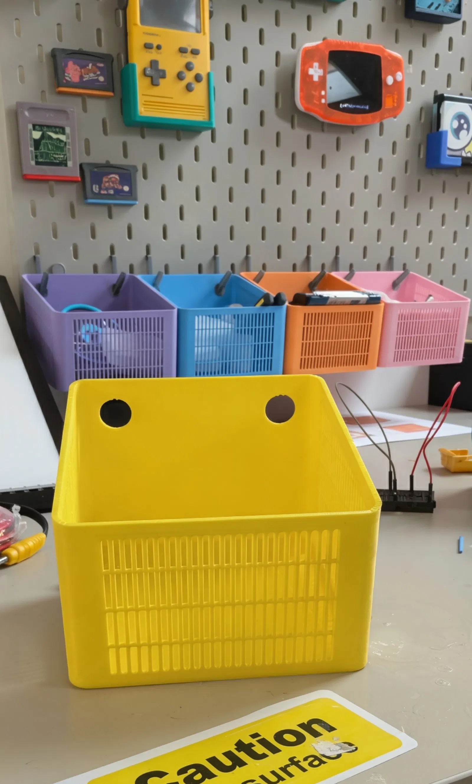 Khi set up cái skadis “chuẩn bài” của tụi mình, tụi mình muốn mấy cái basket dùng kèm có thể tháo ra dễ dàng, thay vì bị gắn chặt lên board.