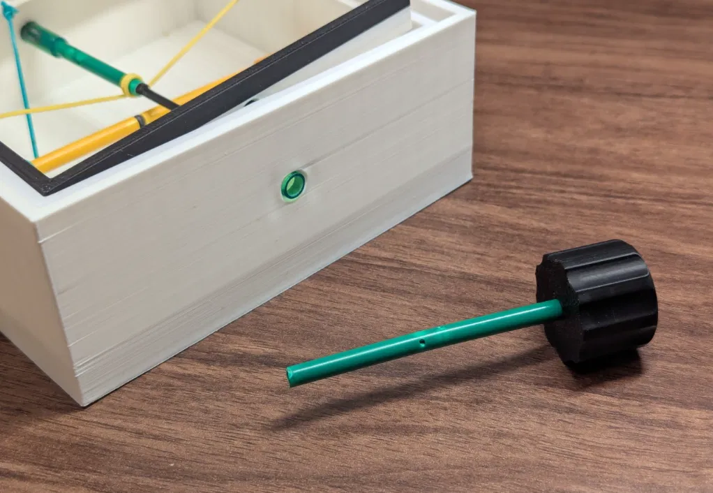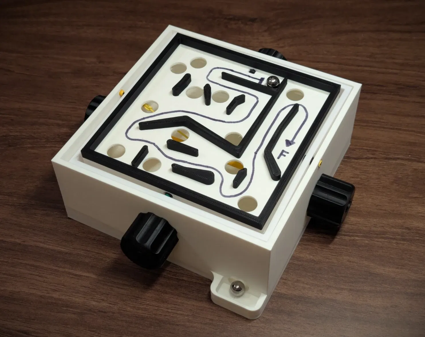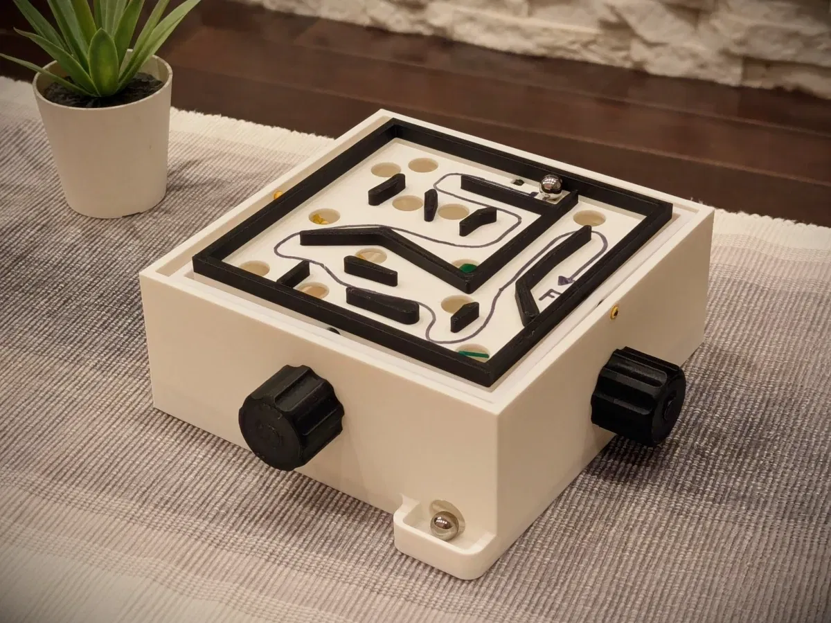 Điều khiển viên bi về đích bằng cách nghiêng bàn chơi, né lỗ và chướng ngại. Thiết kế dựa trên Brio labyrinth, dùng BIC Pencil Pivots cho chuyển động mượt, hỗ trợ thay mê cung tùy biến dễ dàng.