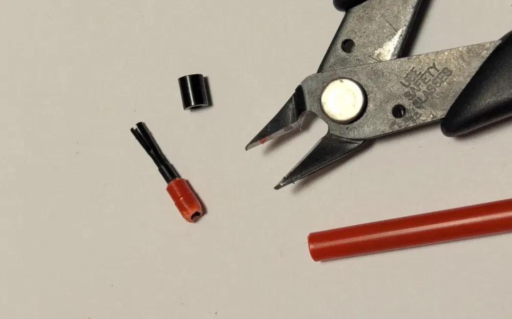Tháo kẹp bút (pencil clip) bằng cách vặn với kìm. Cắt 2.5mm (1") ở đầu của 4 ống ngoài (outer tubes). Các đoạn này sẽ làm bạc/ống lót (bushings) cho tay cầm. Sau khi cắt có thể bạn cần nắn lại cho tròn bằng kìm (uốn lại thành hình trụ).