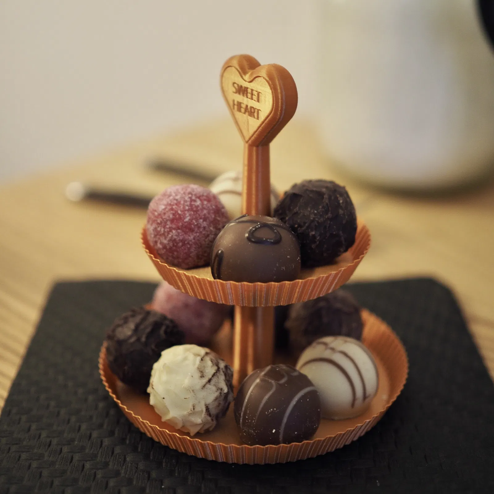 Mẫu kệ etagere mini dùng để đựng chocolate. Bạn cần in đầy đủ cả hai phần của kệ, sau đó canh cho khớp và bắt vít lại với nhau để lắp ráp hoàn chỉnh.
