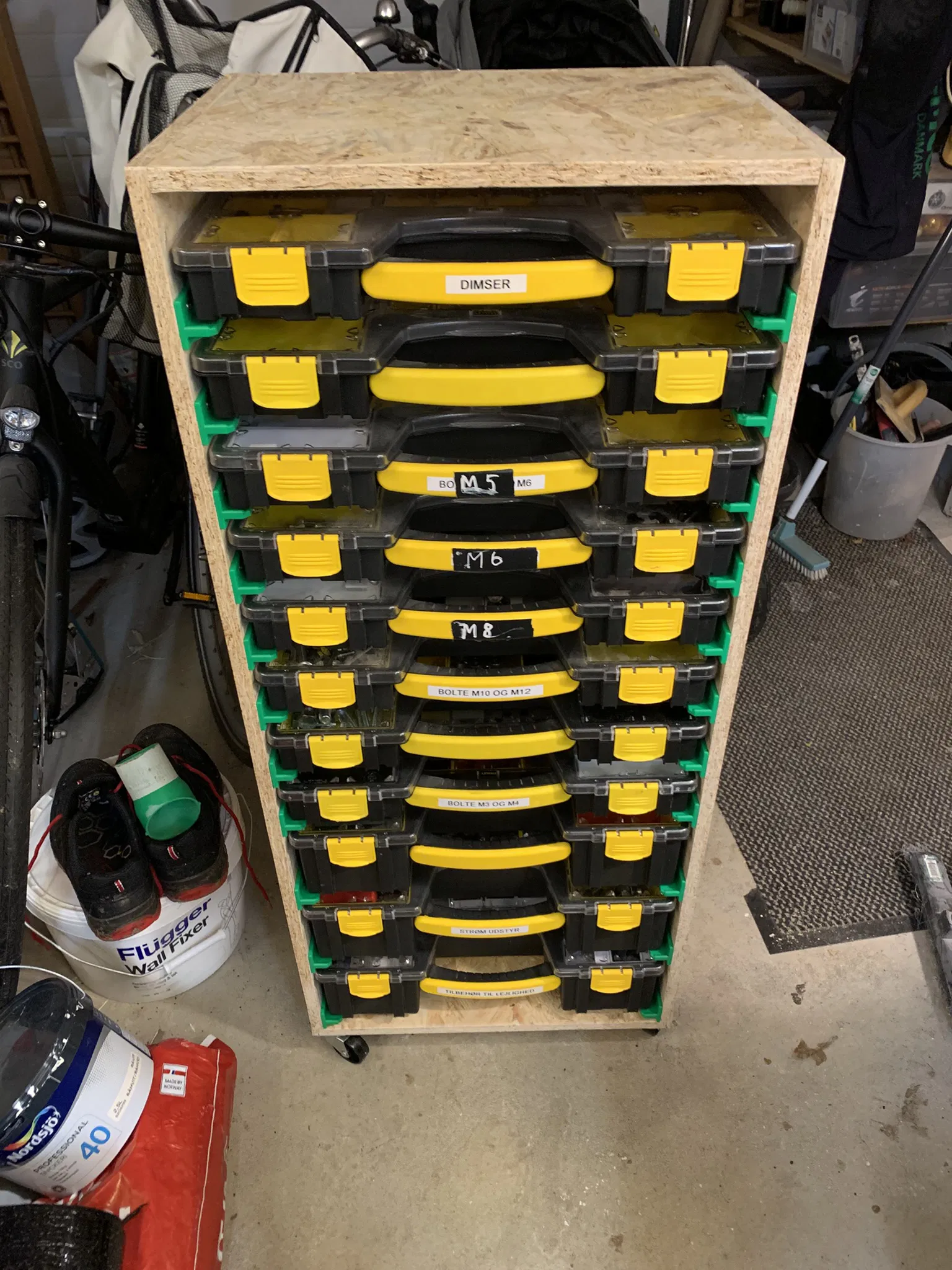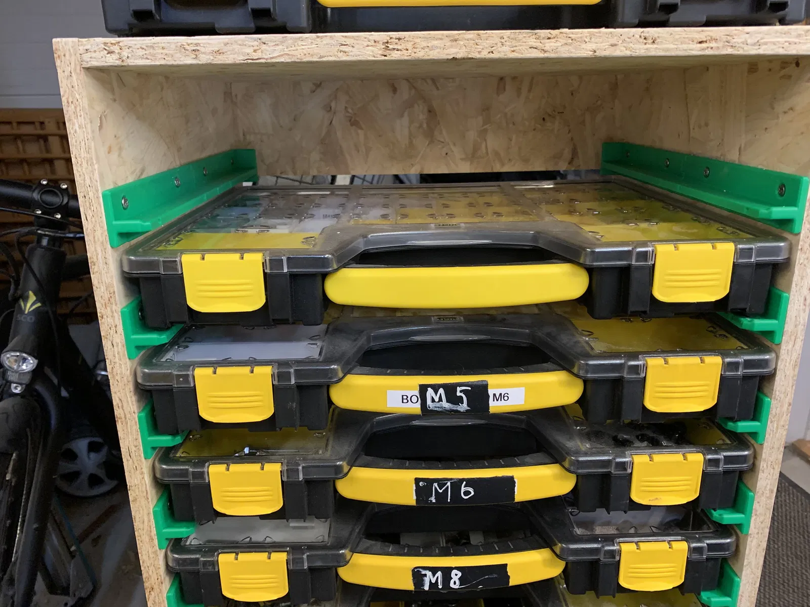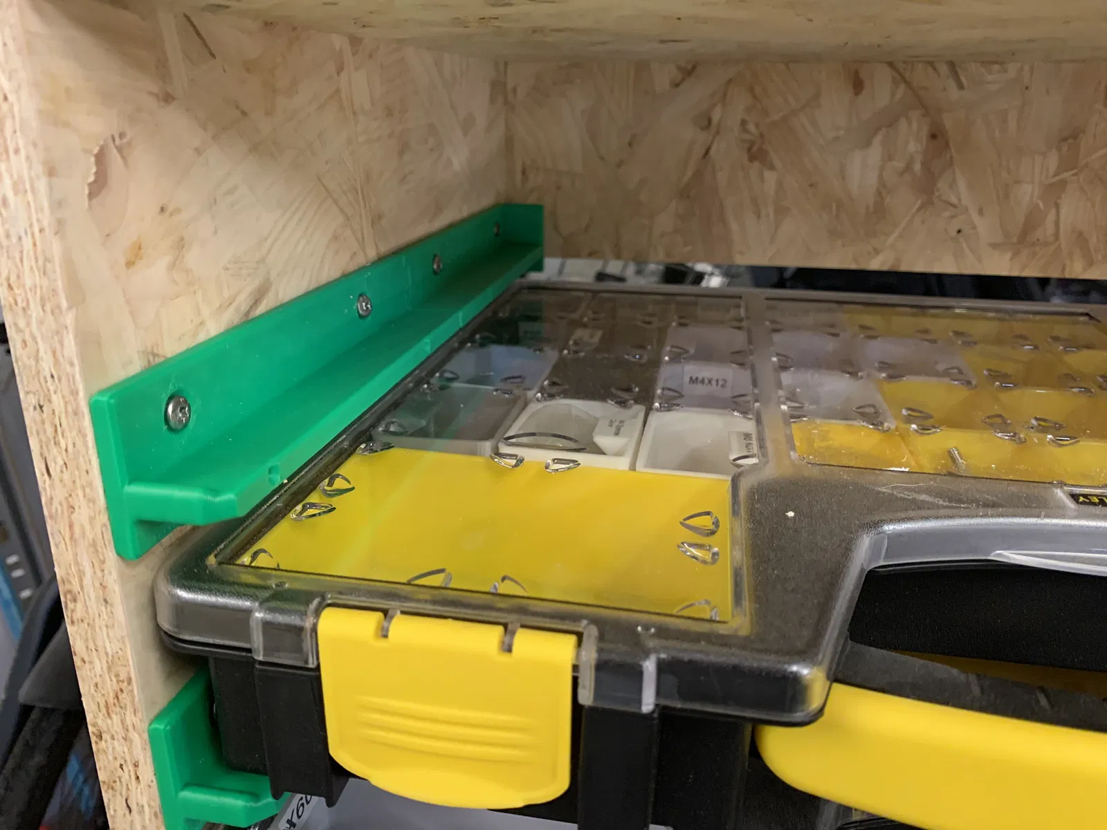 Ray để lưu trữ các hộp Stanley organizer. Ray sẽ khóa hộp cố định để không bị tuột rơi ra, nhờ có một gờ nhỏ ở phía trước. Hộp sẽ nằm phẳng (flush) với mặt trước của tủ, nên bạn sẽ không bị vướng hay đụng vào.