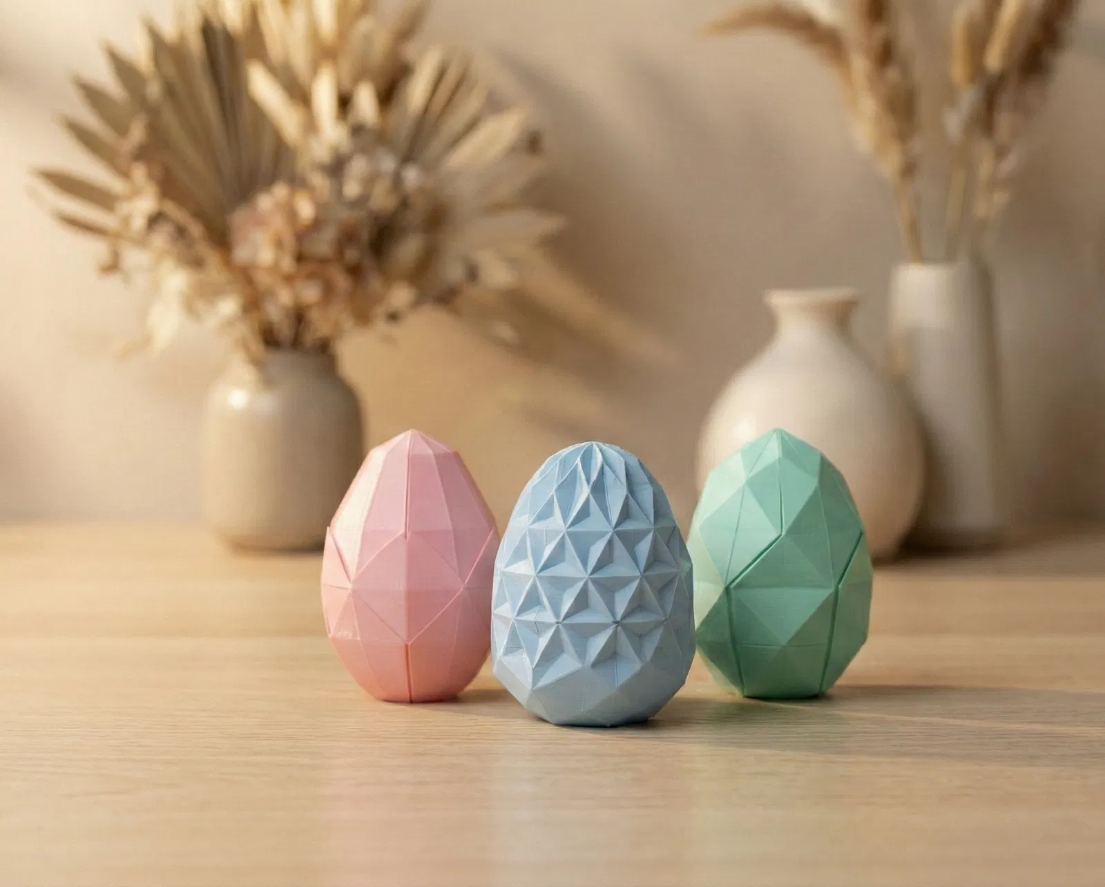 Tổng quan 💡 Sao phải chọn trứng thường thường khi bạn có thể có một “kiệt tác” đa diện? Những thiết kế này chơi với ánh sáng và bóng đổ, tạo hiệu ứng rất đẹp, đặc biệt khi dùng filament tông pastel hoặc matte. Dù bạn đặt trên bệ cửa sổ, bàn làm việc hay làm centerpiece, tụi nó đều mang lại cảm giác “đúng chất designer” cho mùa Easter. 🎨