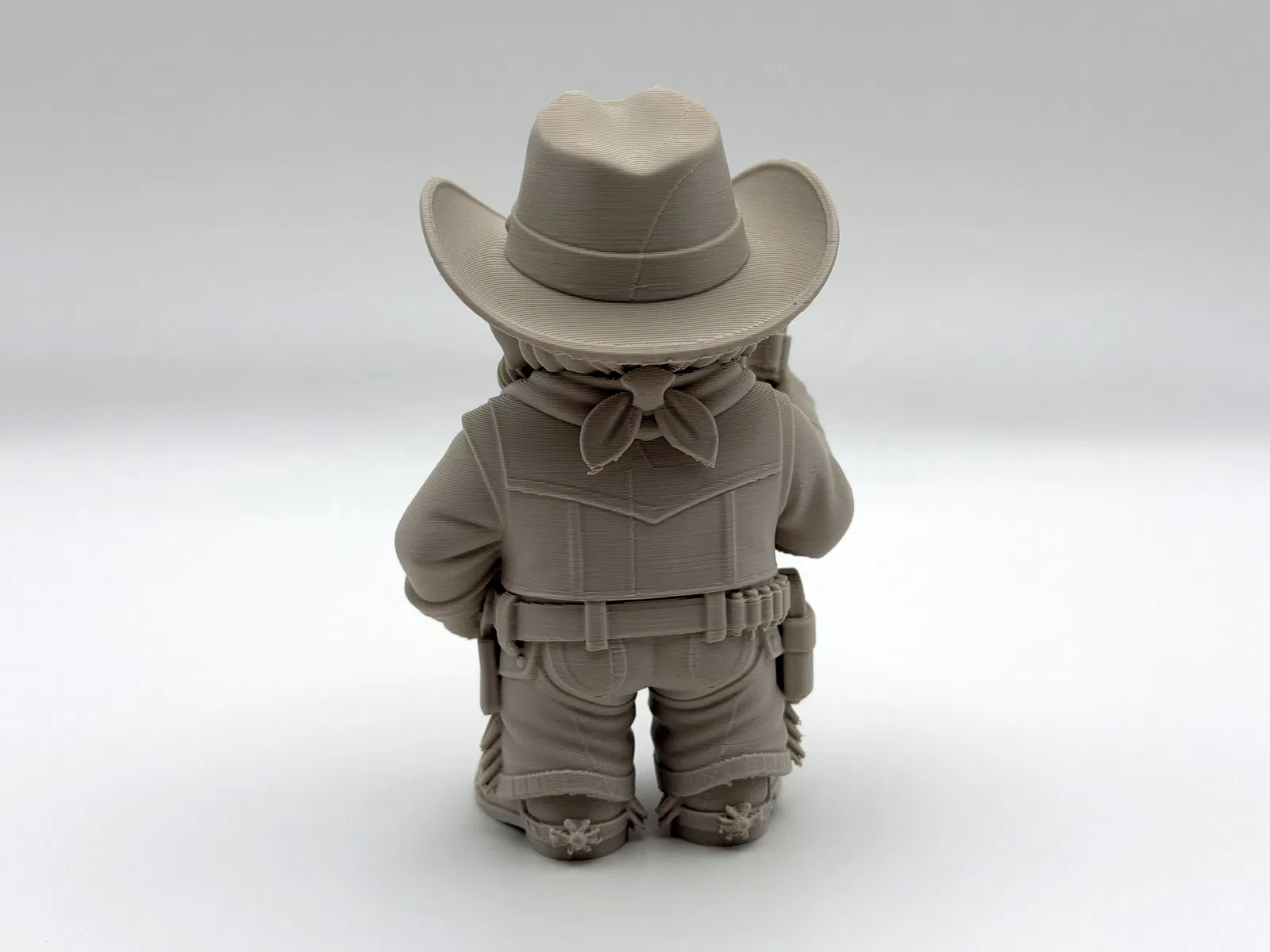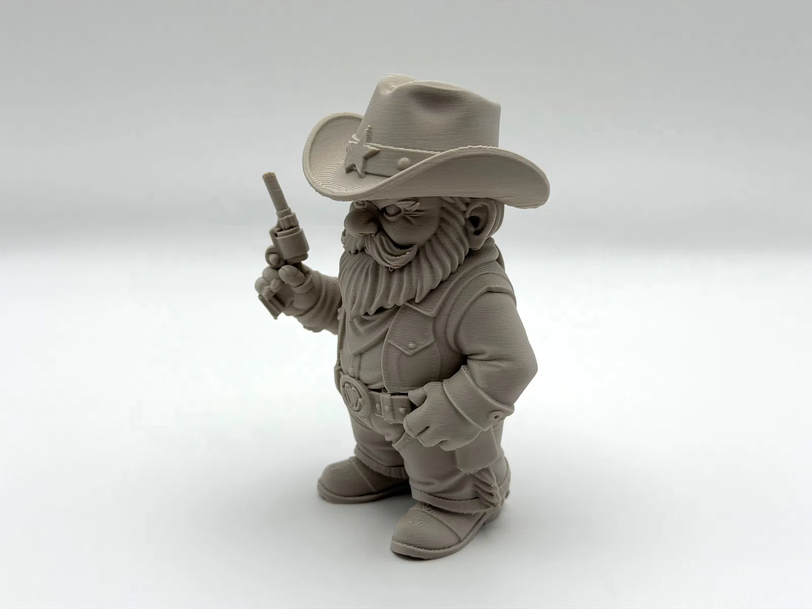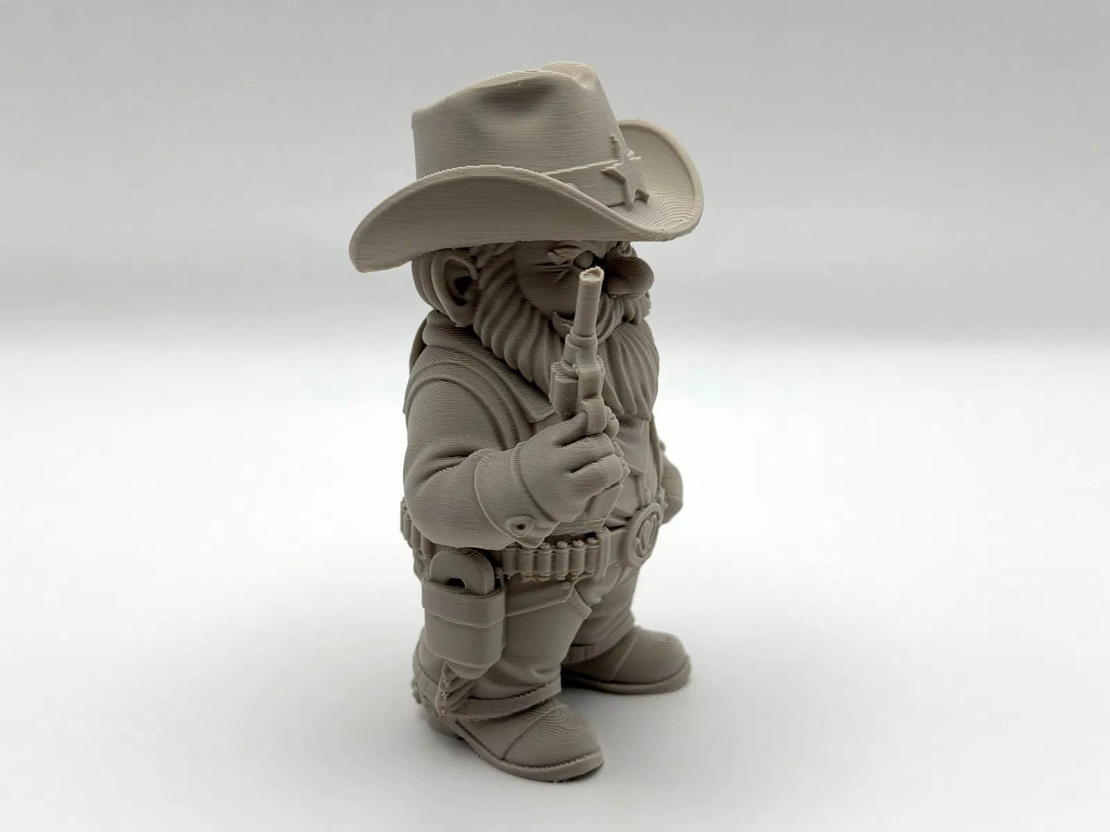 Cowboy Garden Gnome – gnome cao bồi kiểu cảnh sát trưởng, canh giữ khu vườn khỏi “kẻ phá phách” và cỏ dại. In cần ít support; organic-style supports dễ bóc, chỉnh Z-top height để tháo nhanh hơn.