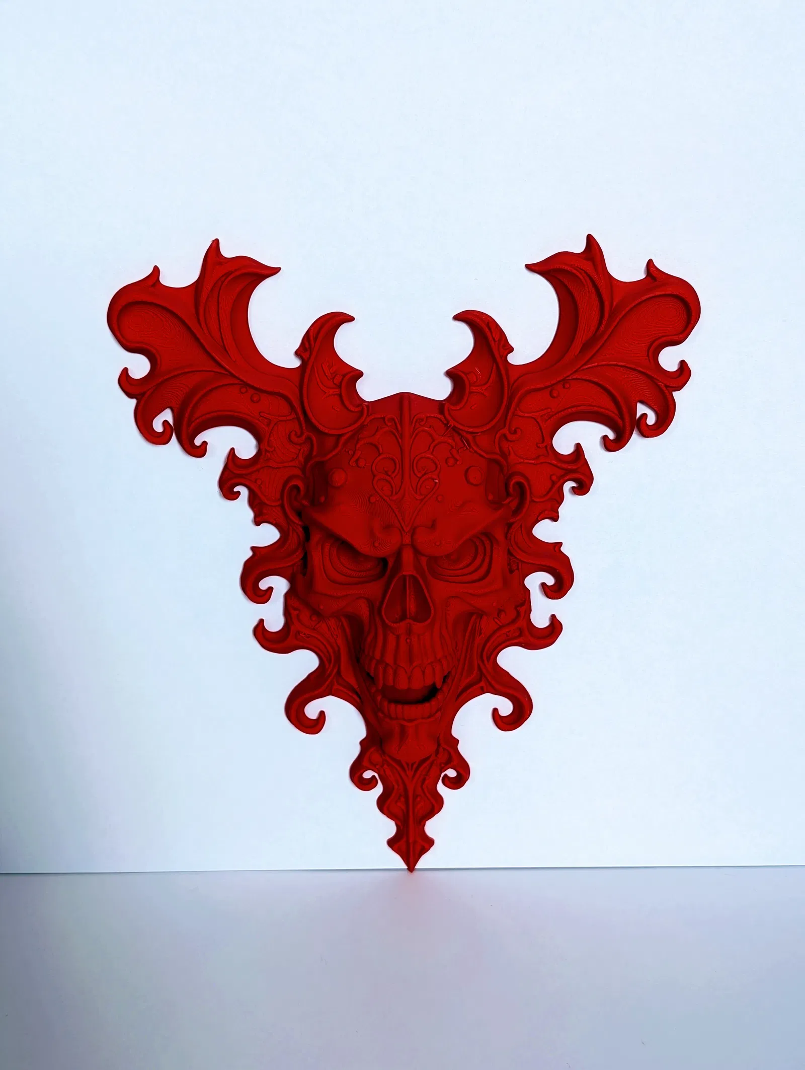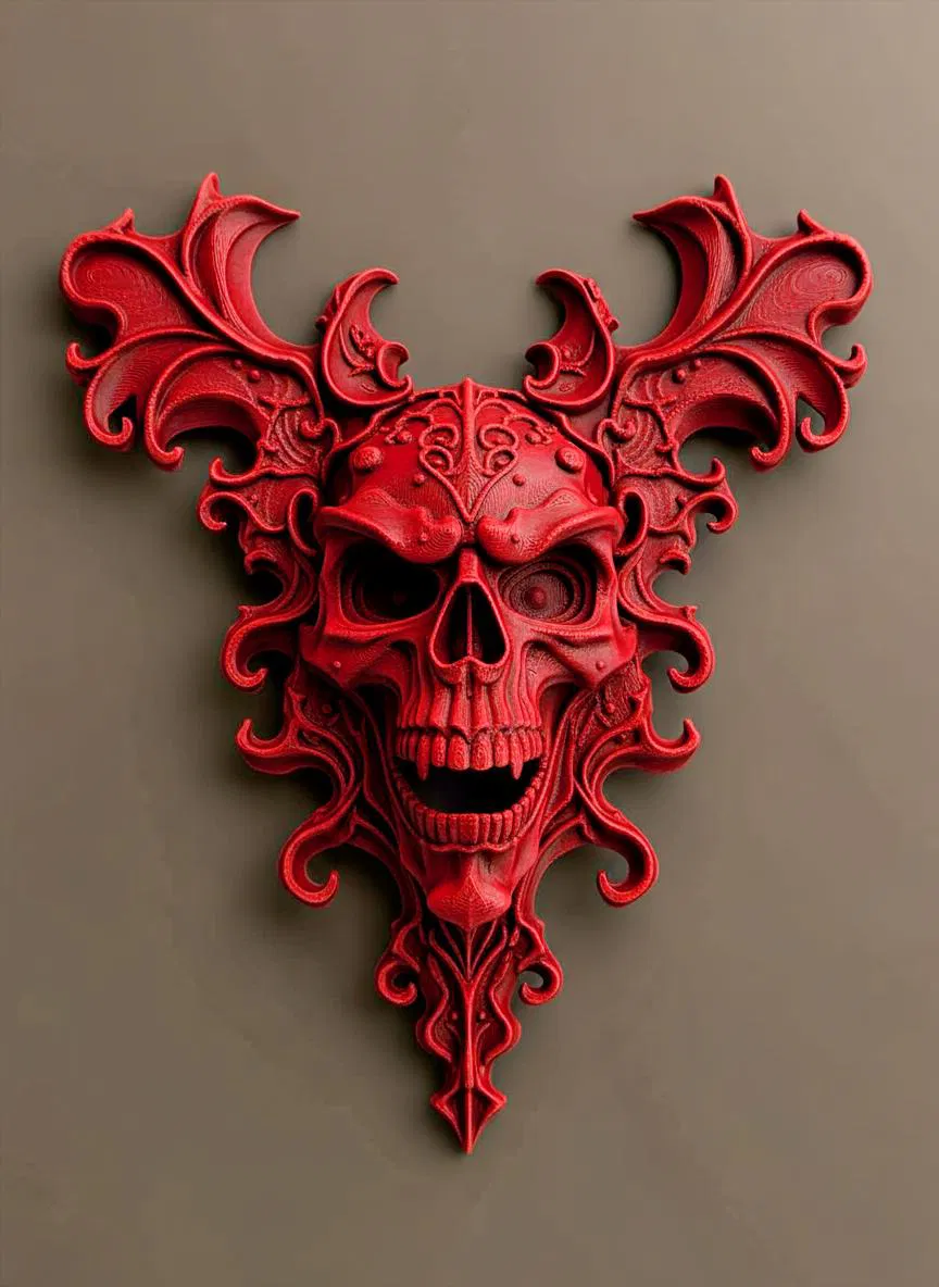 Phù điêu bas-relief hình sọ phong cách gothic với họa tiết tinh xảo và phần “sừng” uốn lượn kịch tính. In một màu, dễ sơn hoàn thiện. Có lỗ treo phía sau (cần supports) để treo tường chắc chắn.