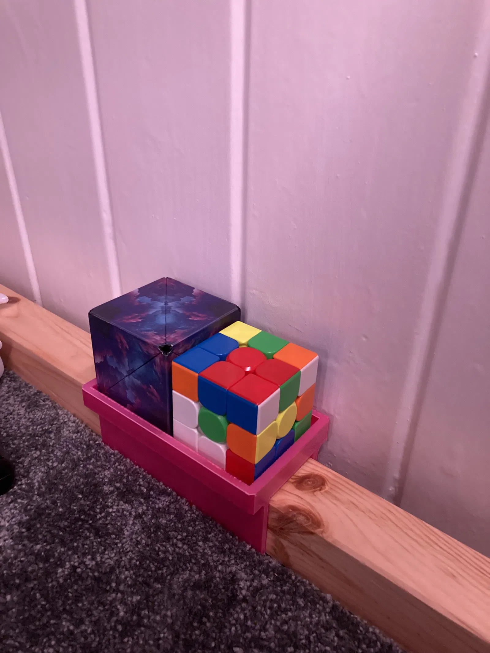 Khay đặt vừa khít lên thanh rail của giường, dùng được cho nhiều thứ nhưng tụi mình thì để vài khối Rubik’s Cube trong đó.