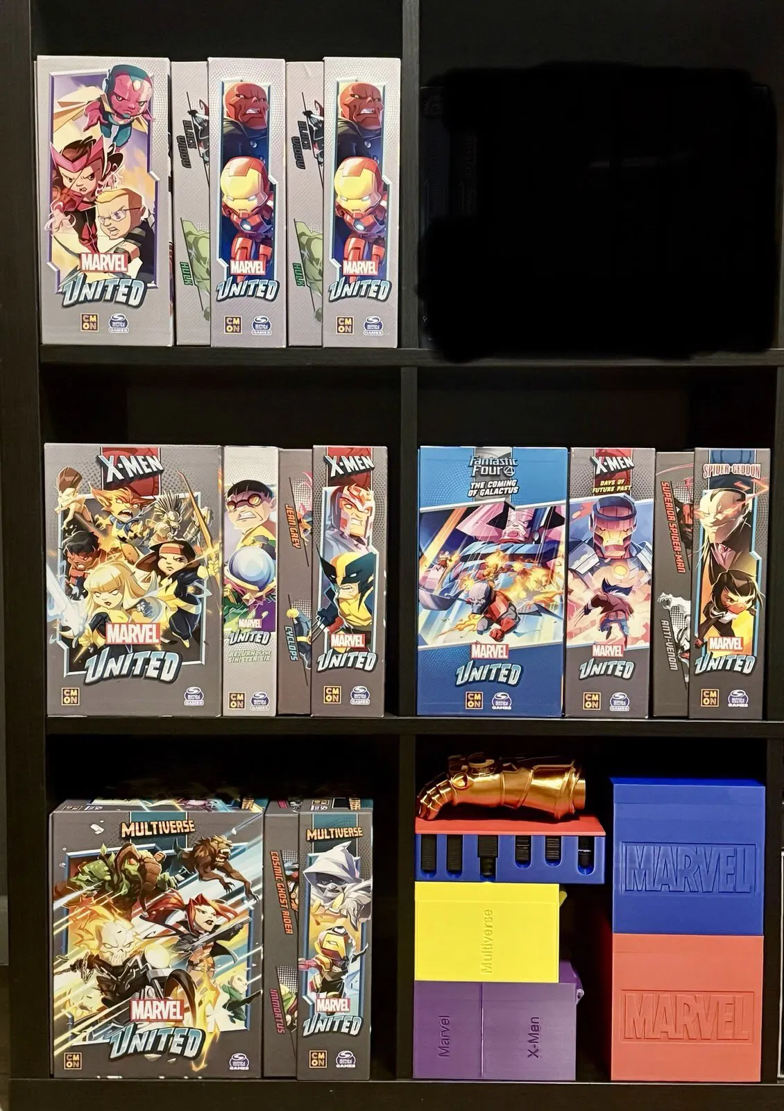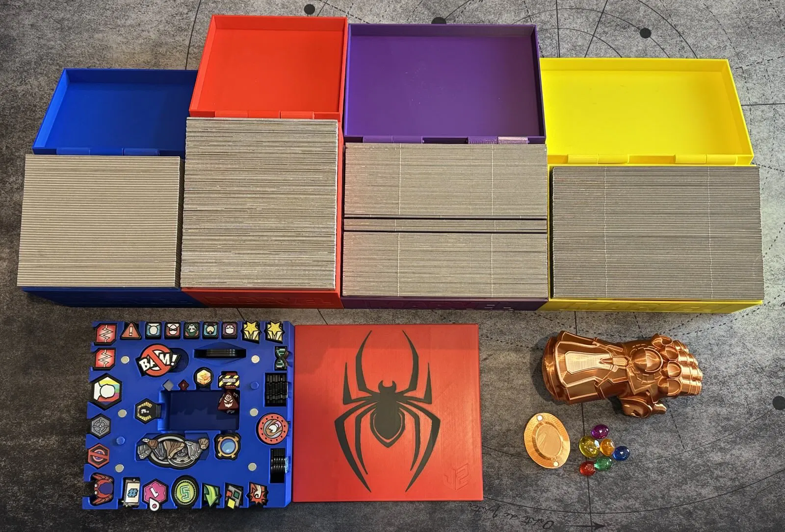 Mình đã sưu tầm thiết kế từ các thành viên cộng đồng như @tshelly và @PengLord, chỉnh sửa một số cái, và tự tạo thêm để ra một giải pháp lưu trữ Marvel United đầy đủ rồi để hết ở đây.