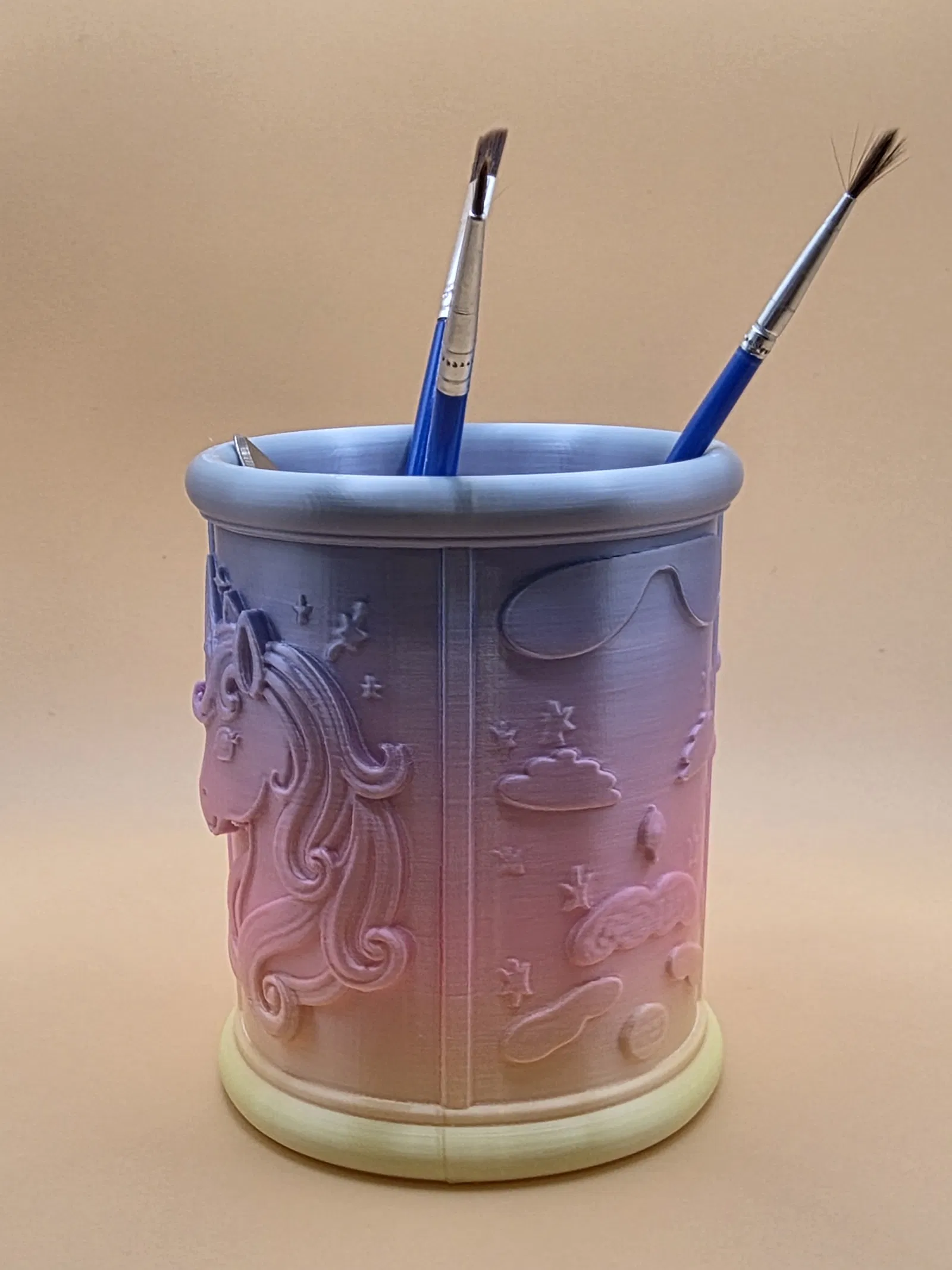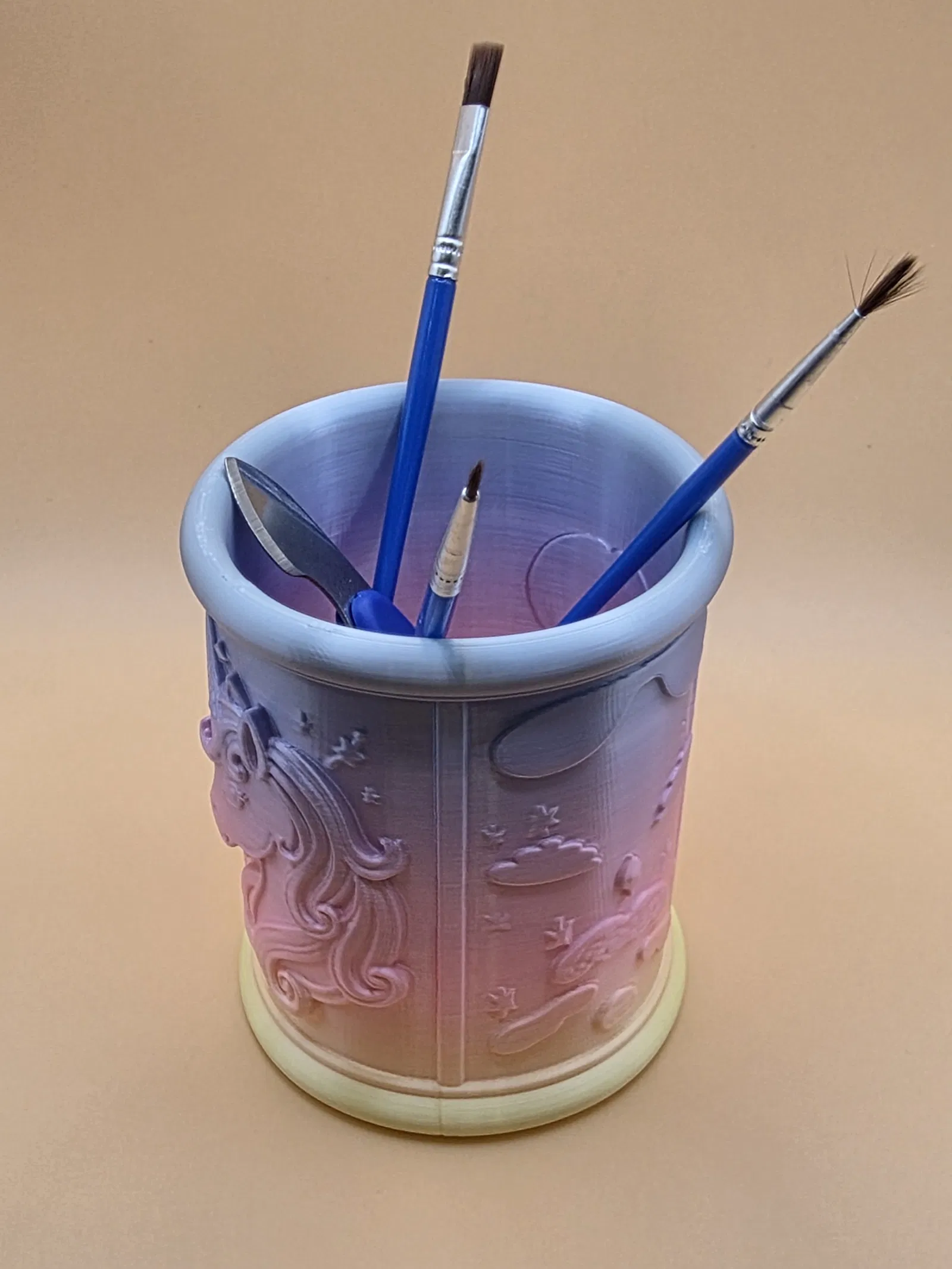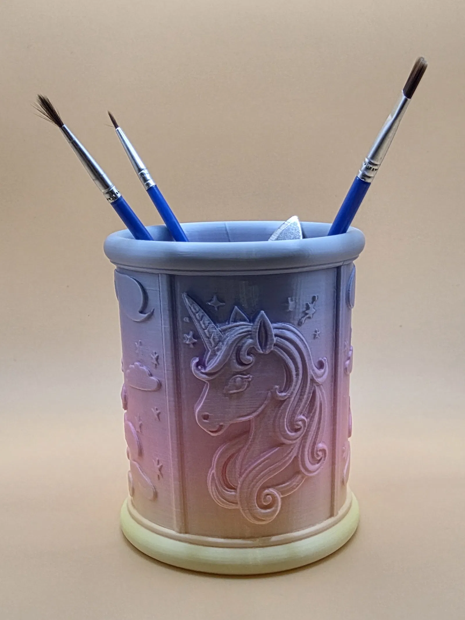 Jednorožčí stojánek na tužky là ống đựng bút/organizer phong cách fantasy với relief kỳ lân và các vì sao. Dáng trụ để được nhiều bút, cọ, bút lông; dễ in, đứng form tốt, hợp phòng bé hoặc góc sáng tạo.