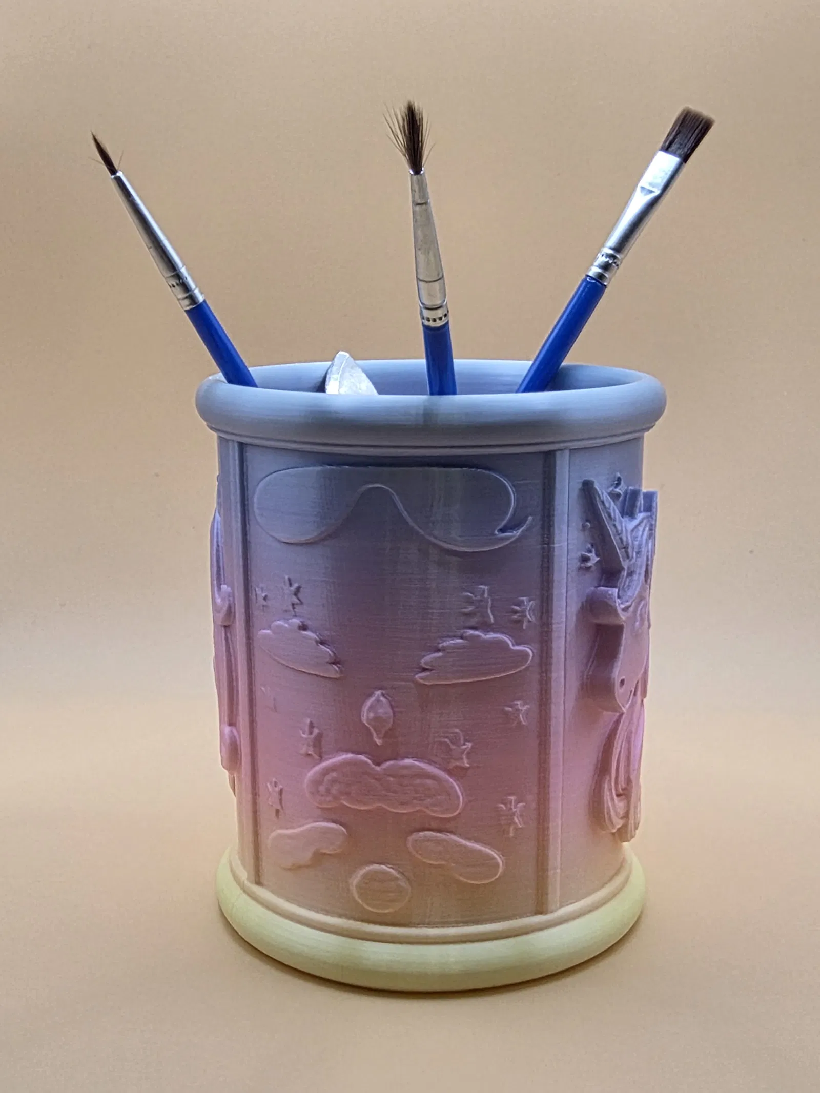 Jednorožčí stojánek na tužky là một món organizer vừa “ảo diệu” vừa mang tính trang trí, kết hợp giữa tính thực dụng và vibe fantasy nhẹ nhàng. Phần relief kỳ lân kèm các vì sao tạo cho model vẻ ngoài dễ thương mà vẫn sang, và nhờ dáng hình trụ nên bạn có thể để thoải mái nhiều cọ vẽ, bút chì hoặc bút lông.