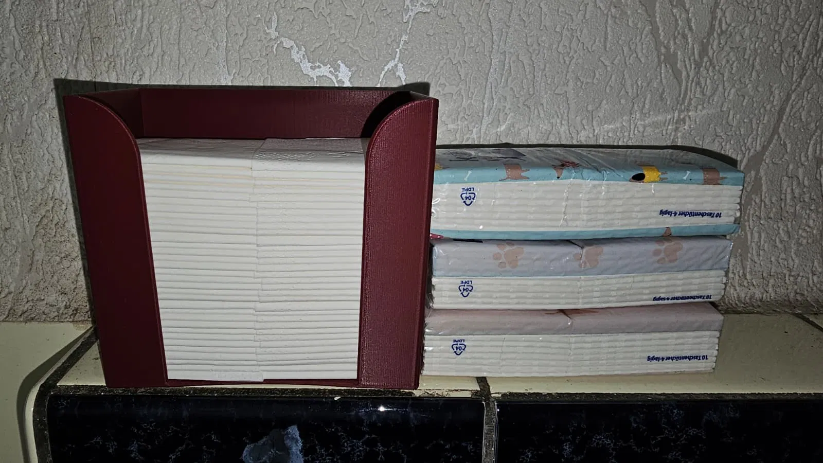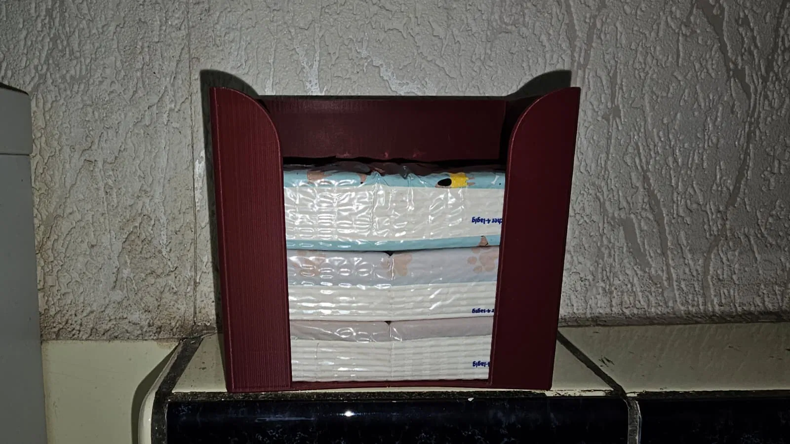 Một cái hộp/khay nhả khăn giấy nhỏ gọn cho các loại khăn giấy bán sẵn ngoài thị trường như Tempo hoặc kokett.