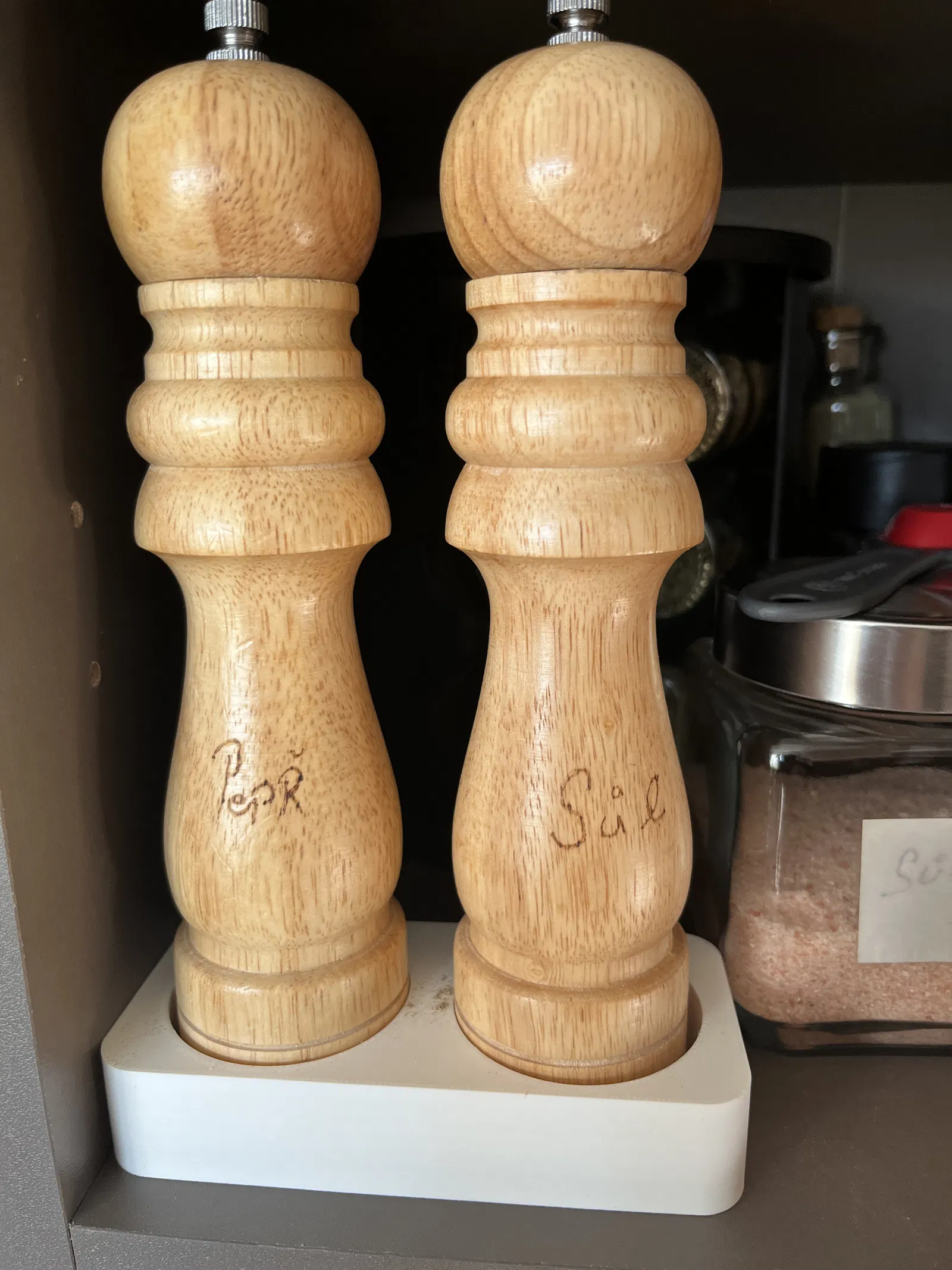 Giá đỡ đơn giản dành cho cối xay muối và cối xay tiêu, giúp để gọn gàng trên bàn bếp hoặc bàn ăn. Chỉ cần in với standard settings là dùng được ngay.
