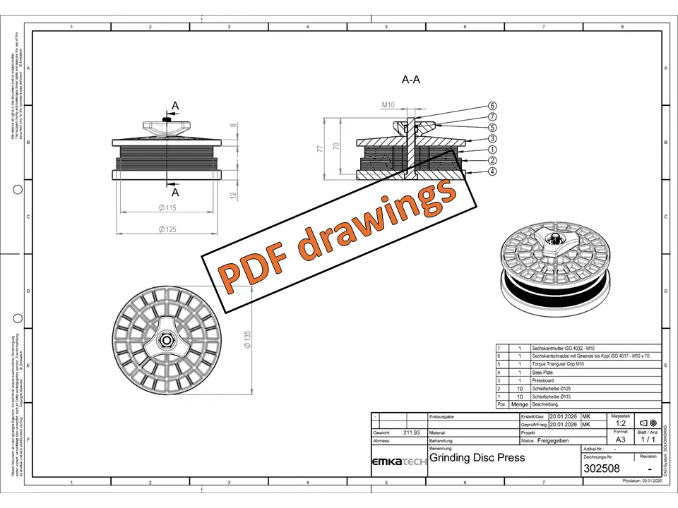 Grinding‑Disc Press là một dụng cụ ép chắc chắn và đáng tin cậy, được thiết kế để canh tâm và làm phẳng chính xác các đĩa mài kích thước Ø115 mm và Ø125 mm dùng cho máy mài góc (angle grinder) phổ thông. Cơ cấu vít đặt đúng tâm giúp tạo lực ép đều trên toàn bề mặt đĩa, rất phù hợp cho xưởng, gia công kim loại, sửa chữa và nhu cầu DIY.
