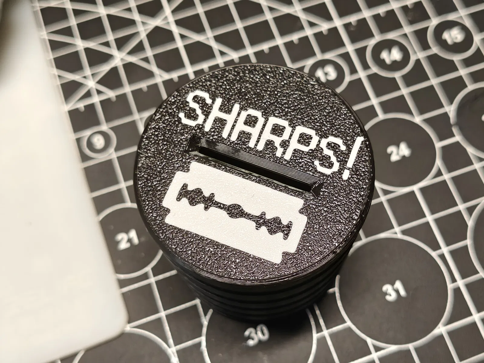 Mẫu nắp cho thùng đựng lưỡi dao cạo DE đã qua sử dụng, được thêm chữ cảnh báo "Sharps!" và hình minh họa lưỡi dao. Phù hợp để in 3D và gắn lên thùng nhằm nhắc nhở an toàn khi xử lý.