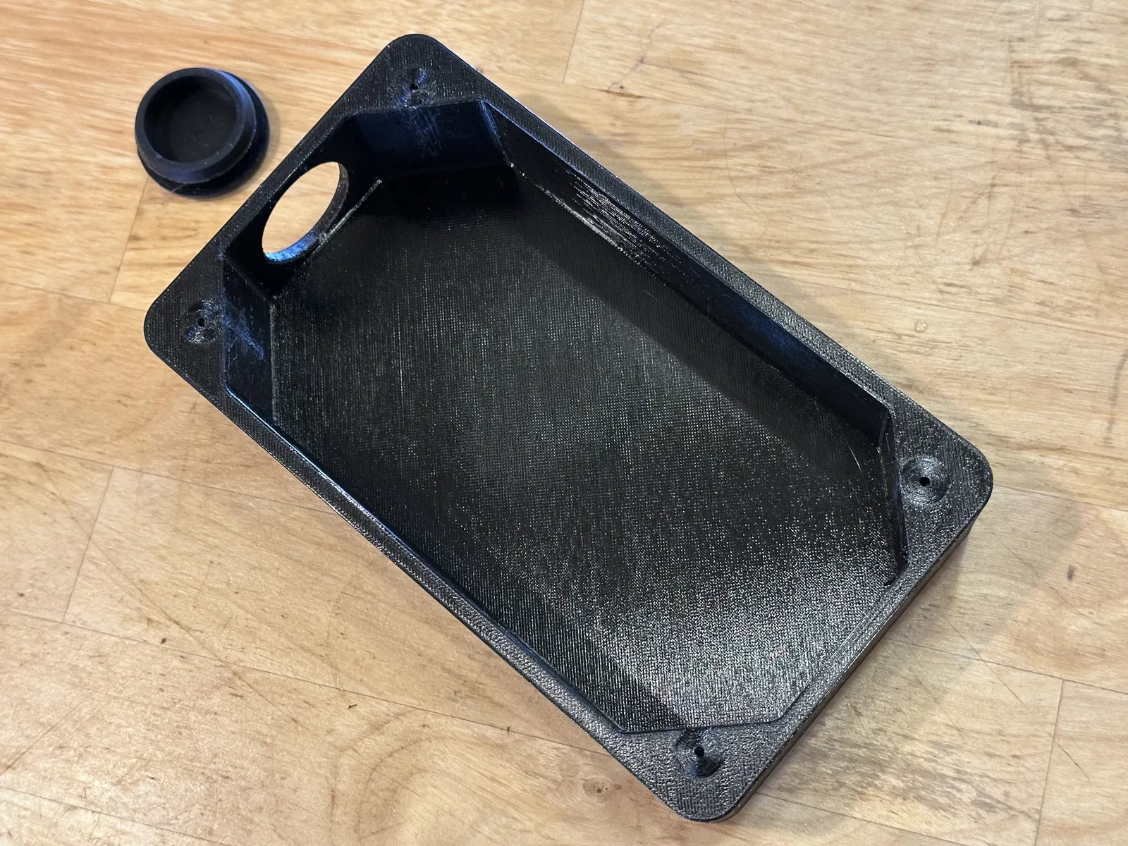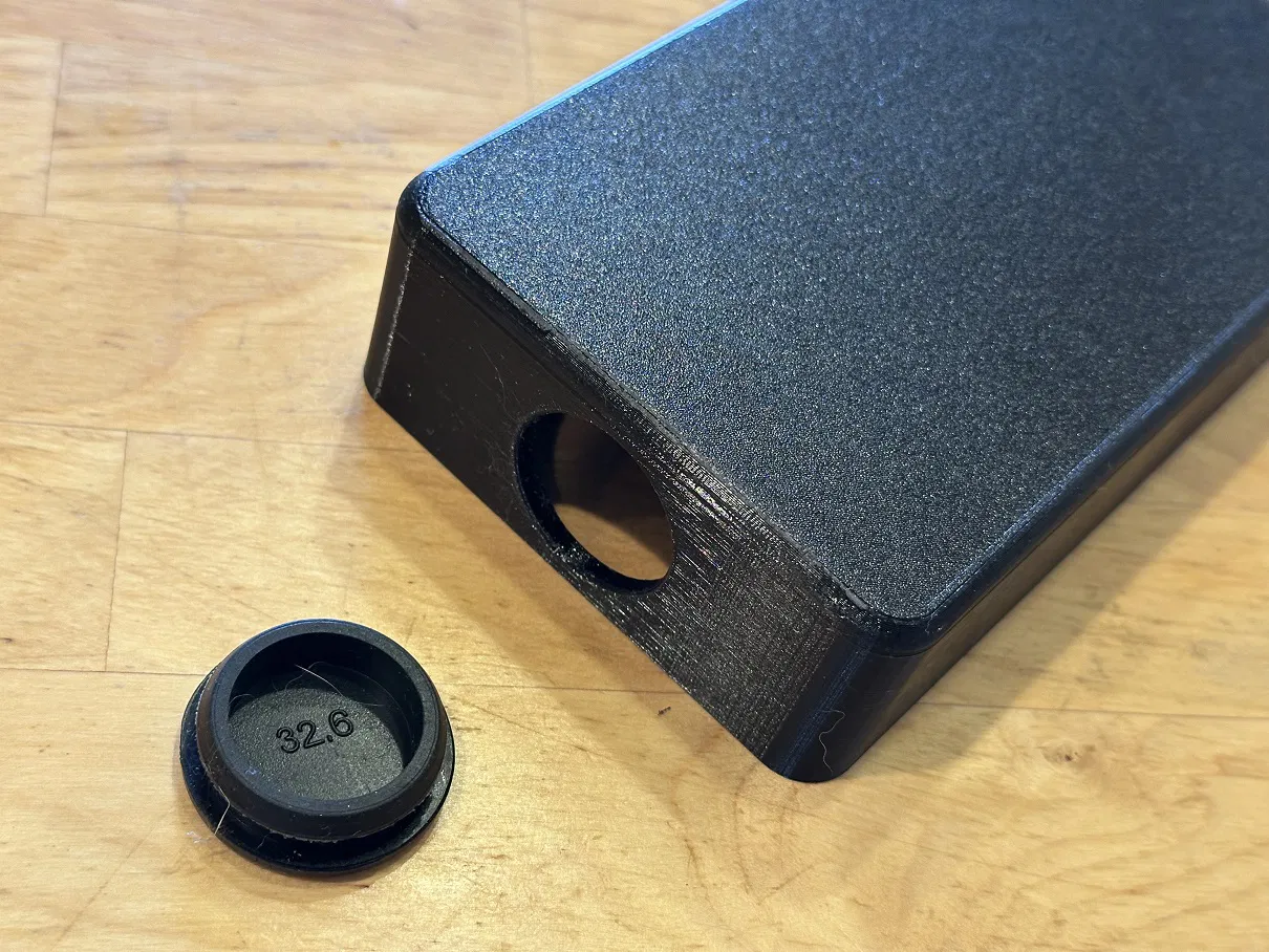 Độ dày thành hộp danh nghĩa khoảng 0.2". Ở một đầu có lỗ 1.25" để lắp rubber grommet cho dây đi xuyên qua. Bốn lỗ vít có đường kính trong (ID) 0.1", lắp vừa đẹp vít tự ren #6 x 3/8".