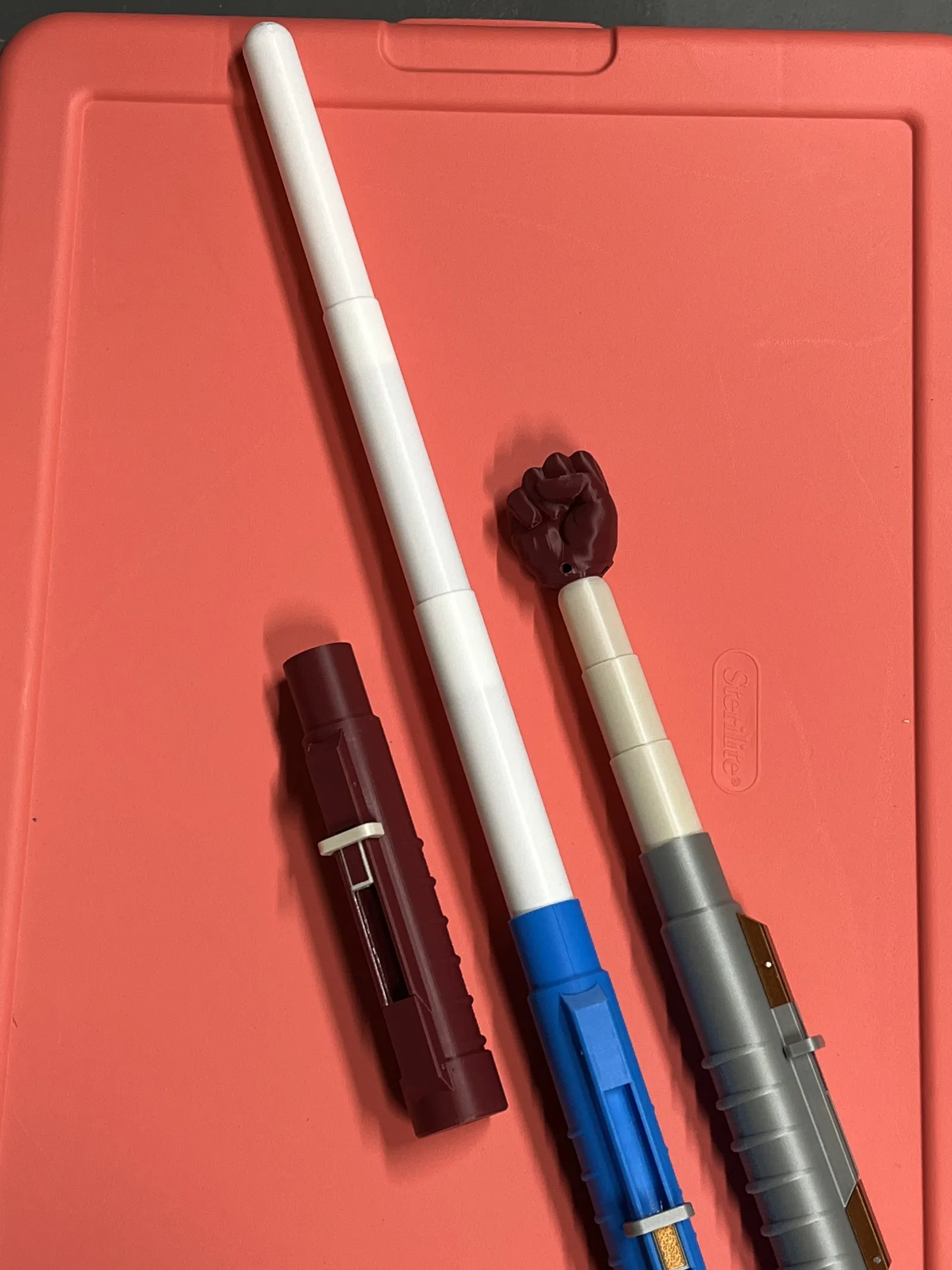 Automatic Lightsaber AKA The Puncher: trượt nút để lưỡi/“cú đấm” bung ra và thu vào. Dùng hệ ròng rọc với dây câu, cần in Blade ở vase/spiral mode và lắp ráp rất kiên nhẫn, có chà nhám + bôi trơn.