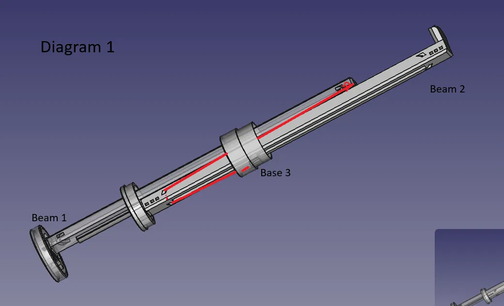 Trượt Beam1 và 2 vào nhau và đảm bảo trượt tự do. Bóp chúng lại và trượt qua lại để xử lý chỗ nào bị cấn. Dán Beam1 vào Base1 và Beam2 vào Base2. Đảm bảo đúng chiều và nhìn phải vuông/vẳng.