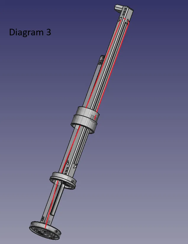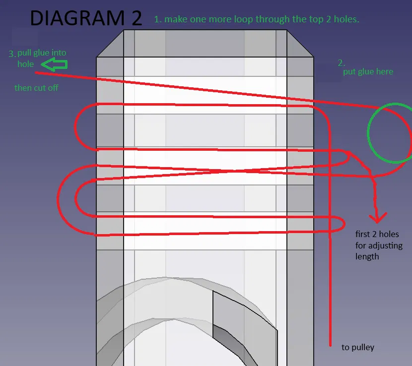Xem sơ đồ 3, luồn sợi dây phía trên qua ròng rọc trên của Beam 2. Sau đó đi xuống qua Base3 và 2 tới Base 1. Xem sơ đồ 4. Quấn 1–2 vòng để giữ tạm. Test bằng cách trượt Base2 lên xuống. Giữ dây vừa đủ căng để không tuột khỏi vị trí. Nếu căng quá thì sẽ khó trượt lên xuống. (Bạn có thể kéo giãn dây sau nếu cần.) Luồn đầu dây qua các lỗ nhiều vòng và dán cố định phần đầu thừa.