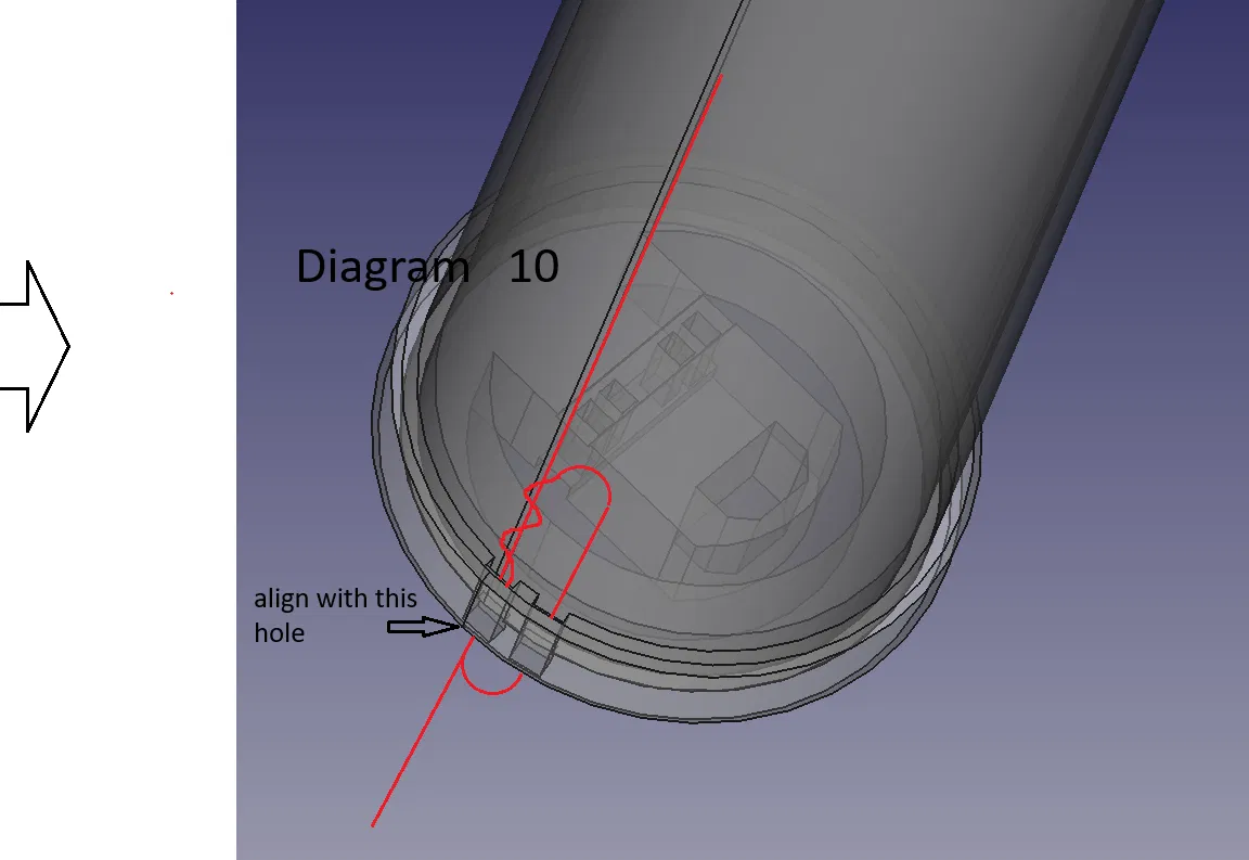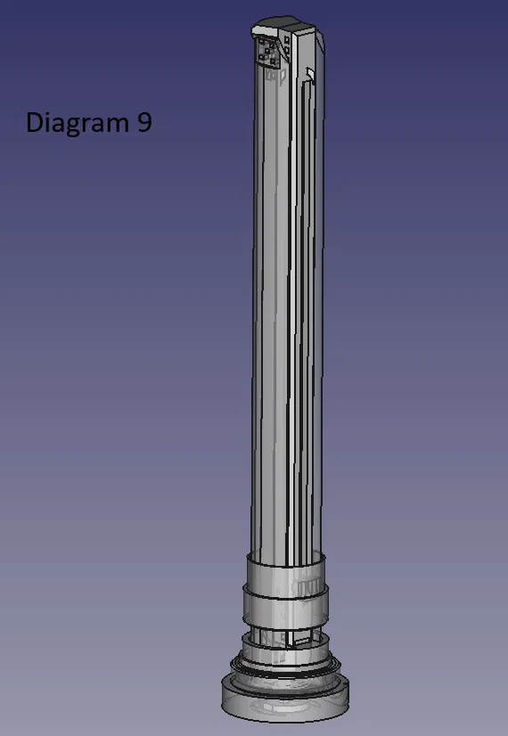 Gắn hai đoạn dây câu vào Beam 2. Nhớ chắc là đúng phía như trong sơ đồ 5. Xem “mechanical diagram” và các sơ đồ 6, 7, 8. Một sợi sẽ đi qua ròng rọc trên của Beam 1, rồi buộc vào đáy của BaseBeam. Sợi còn lại sẽ đi qua ròng rọc dưới và buộc vào đỉnh của BaseBeam. Mỗi lần đi dây mới, luôn cho dây chạy OVER (ở phía trên) các dây đã có. Công đoạn này cực kỳ bực vì dây câu hay vòng ra sau beam hoặc tự nhiên rối vào thứ gì đó. Siết căng mọi thứ từ từ, vừa làm vừa kiểm tra hoạt động bằng cách giữ BaseBeam và trượt Base1 lên xuống. Đảm bảo nó chạy hết biên độ trước khi cố định hai đầu (luồn qua lỗ nhiều vòng và dán cố định phần đầu thừa). Khi buộc lên đỉnh BaseBeam, đặt nó ở vị trí thu vào như sơ đồ 9 và đẩy các Beam ra để dễ tiếp cận lỗ. Đảm bảo dây đủ căng để không tuột. Các điểm buộc phải gọn, không để vòng dây thò ra. Bôi petroleum jelly lên tất cả các dây và kéo qua lại để nó ngấm vào các ròng rọc. Cẩn thận đừng dính lên các Base nơi bạn sẽ dán các Blade. Lau phần dư.