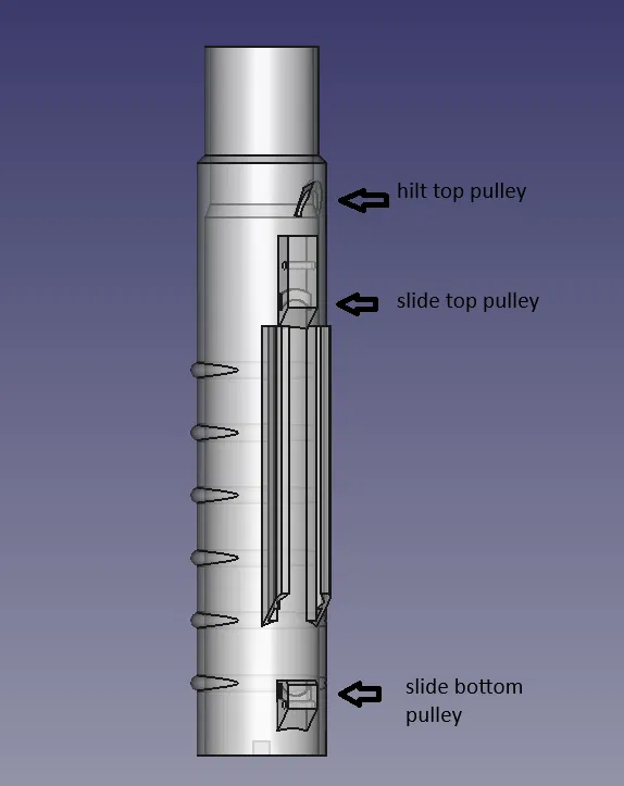 Giờ dùng dây câu .5mm (loại nặng hơn) và gắn vào Base1, xem sơ đồ 10. Đảm bảo không bị tuột. Gấp một nếp trên một đoạn dây câu và đẩy nó qua ròng rọc trên của Hilt. Dùng nó để kéo sợi dây từ Base1 lên xuyên qua Hilt và ra khỏi ròng rọc. Cho sợi dây phía dưới đi qua ròng rọc của Basebeam, rồi trượt lưỡi vào Hilt. Gắn tạm nắp dưới. Kéo luân phiên dây trên và dây dưới để kiểm tra hoạt động mượt. (đừng đẩy lưỡi vì dây sẽ bị dồn cục bên trong hilt) Dùng sơ đồ 11, 12, 13 và mechanical diagram để đi toàn bộ dây (trên và dưới) qua Slide/button trước khi đặt nó vào rãnh. Khi lắp vào rãnh, sẽ dễ hơn nếu các dây phía trên đang căng lúc bạn trượt nó vào. Đảm bảo tất cả dây nằm đúng vị trí dưới slider. Gắn nắp dưới. Trong khi vẫn giữ lưỡi ở trạng thái thu vào, đẩy slider lên đồng thời kéo đầu dây rời của sợi dây phía trên để lấy hết độ chùng. (Có thể bạn phải nới dây phía dưới.) Chỉnh sao cho dây trên căng khi lưỡi thu vào và slider còn cách điểm cao nhất khoảng 2 mm. Nhẹ nhàng kéo slider xuống (hoặc kéo lưỡi ra) trong khi vẫn giữ dây đúng chỗ. Giờ hoàn tất các vòng quấn như sơ đồ 11 để cố định dây. Khi phần trên đã chỉnh xong, làm phần dưới căng (ở bất kỳ vị trí nào), rồi thêm vòng quấn và buộc nó vào dây trên. Chấm ít keo và gắn nắp nút (button cover). Giờ bôi trơn slider và tất cả dây để chất bôi trơn vào được toàn bộ ròng rọc. Lau phần dư (một ít có thể dính lên blade1 vì dây bên trong nằm sát nó).