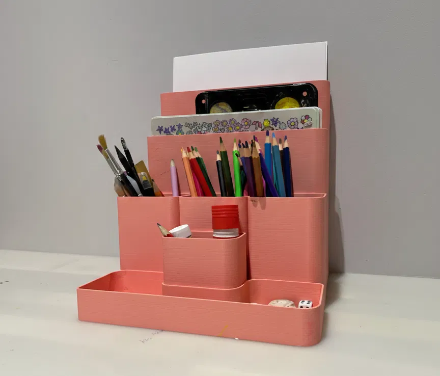 Một mẫu desk organizer để gom gọn toàn bộ đồ dùng sáng tạo của bé. Nhiều ngăn lưu trữ với các độ cao khác nhau giúp bạn để cọ vẽ, bút chì, bút sáp, kéo, keo dán, giấy vẽ và những món đồ cần thiết khác, mà vẫn giữ mặt bàn gọn gàng, sạch sẽ.