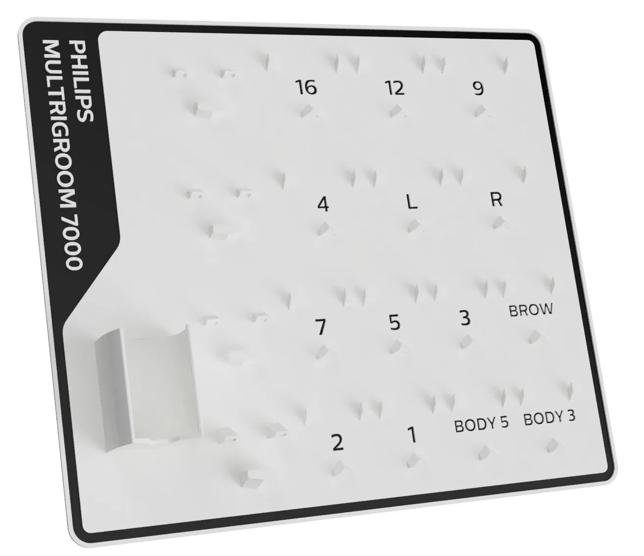 Bộ kẹp clip-on gắn tường cho Philips Multigroom 7000, giữ chắc các blade guards và có dock tay cầm (tùy chọn kẹp sạc). Tối ưu FDM in phẳng, không cần supports, dễ vệ sinh và dễ nhìn – dễ lấy.