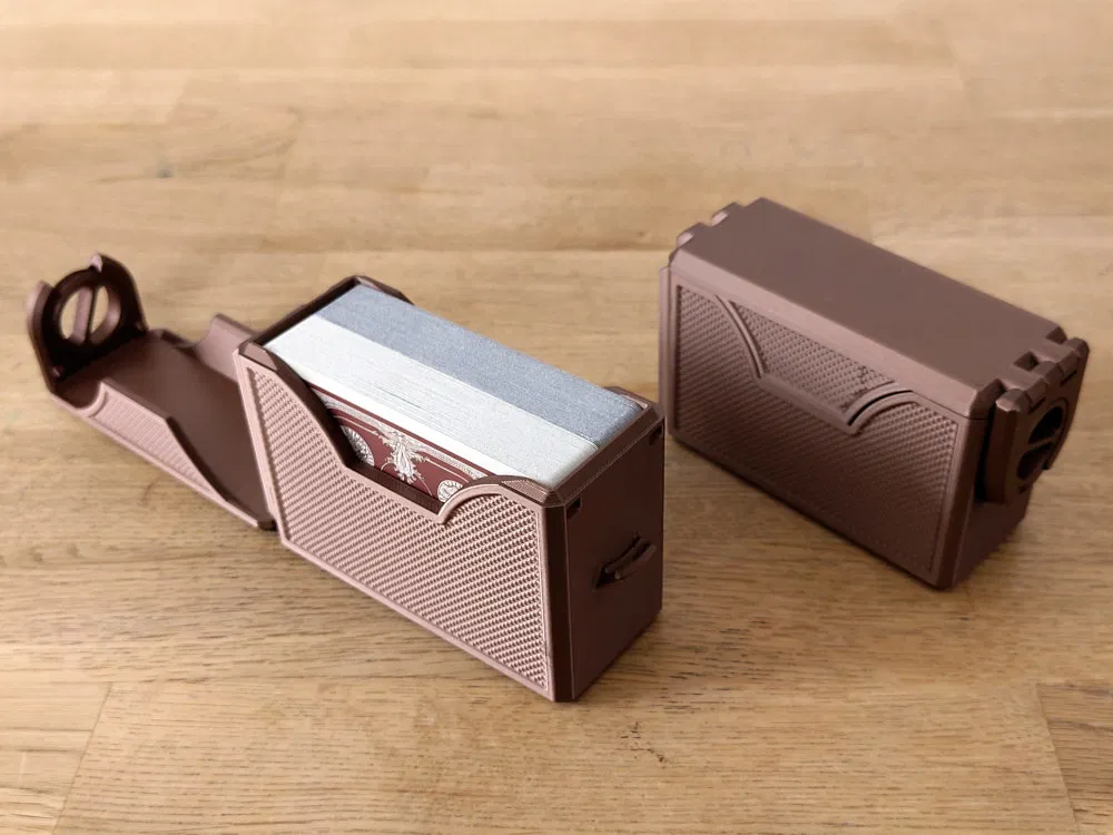 Card vault là hộp đựng bài print-in-place có khóa vặn, chứa 2 bộ bài. Có bản dùng với hoặc không dùng tuck box. In lắp sẵn, không cần supports/brim, nhưng do in dạng mở nên cần mặt bàn lớn, không hợp máy Mini.