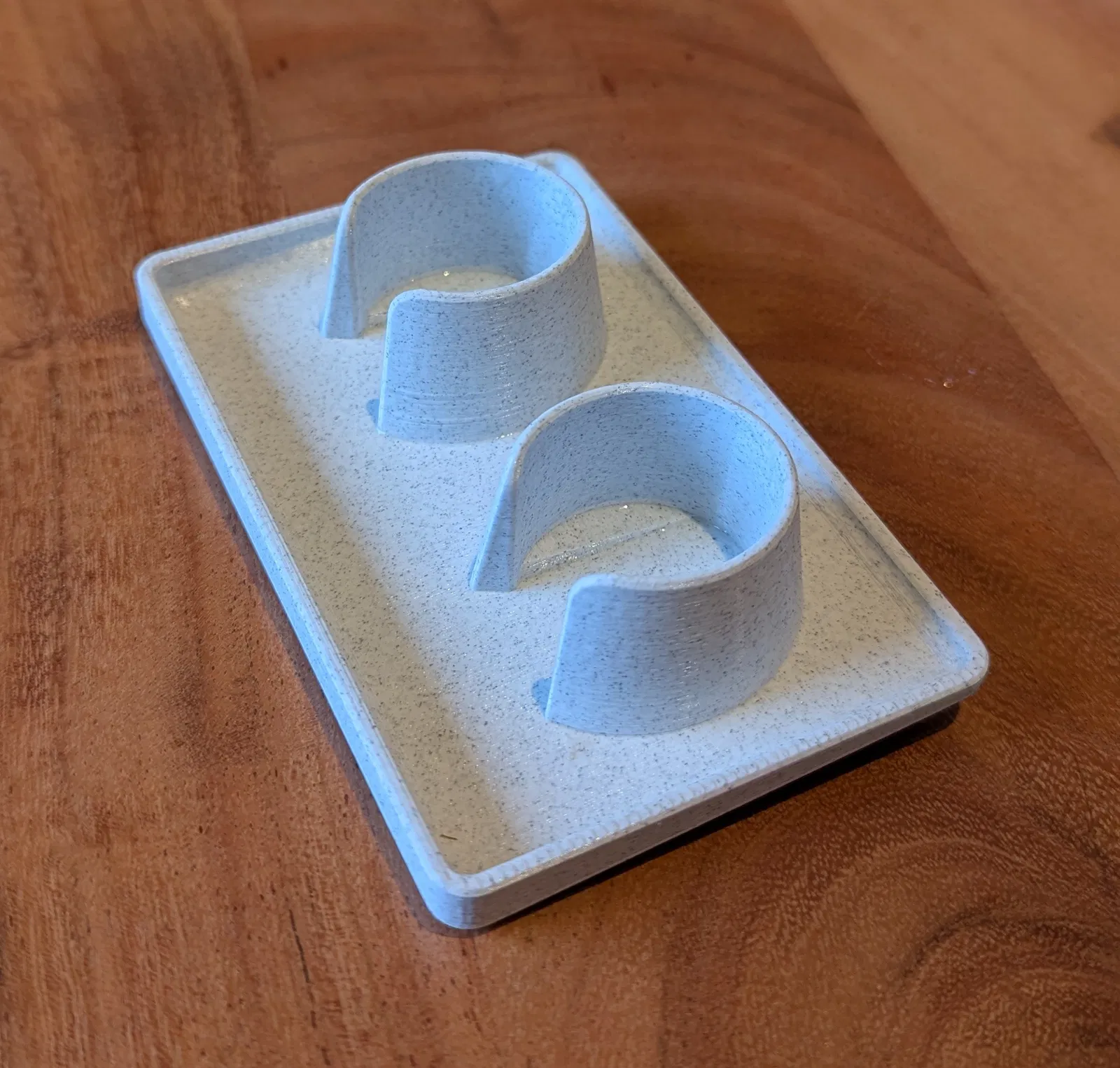 Đế có độ dốc nhẹ để nước dồn về phía trước. Mẫu được in thành 2 phần để mặt trên luôn phẳng—sau khi in xong chỉ cần dán 2 phần lại với nhau.