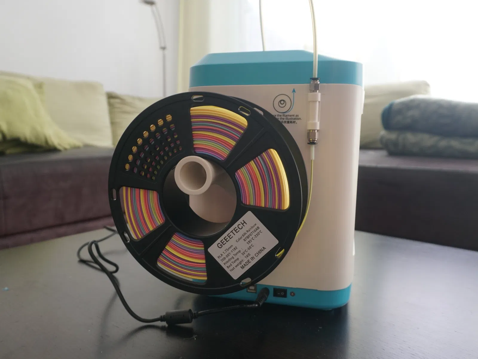 Adapter giữ cuộn filament này được thiết kế riêng cho Geeetech M1M1S nhằm dời vị trí cuộn ra sau để dùng được cuộn filament tiêu chuẩn 1 kg—loại thường không vừa với spool holder zin vì dễ cấn vào cổng USB và cổng nguồn.