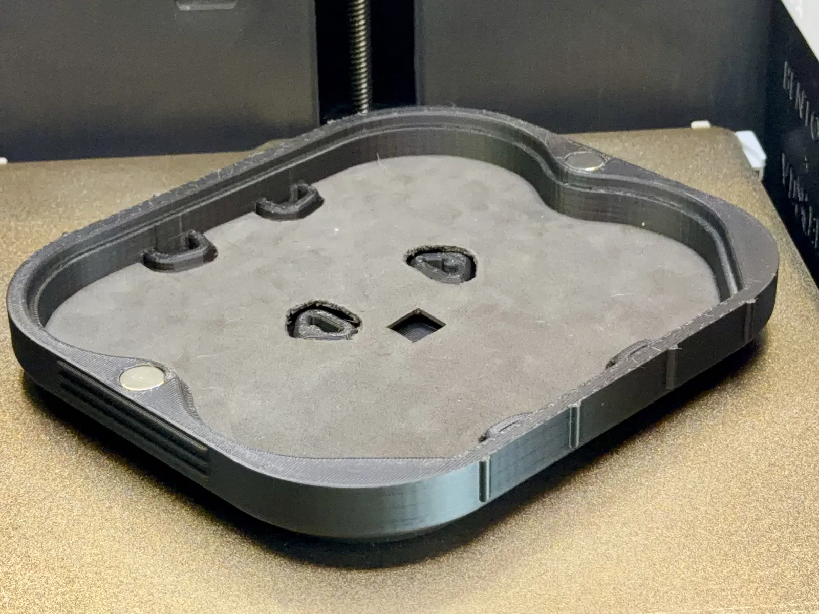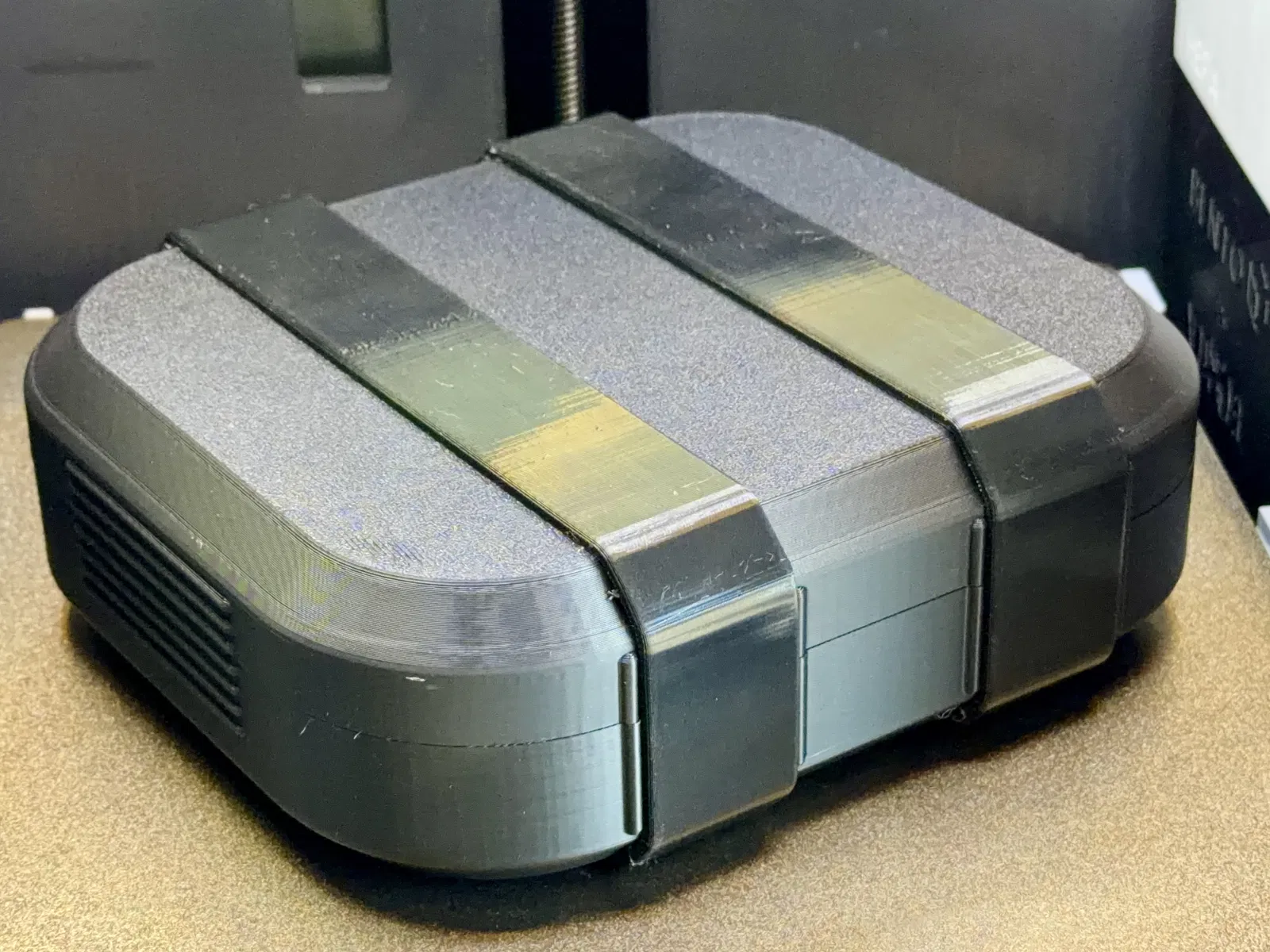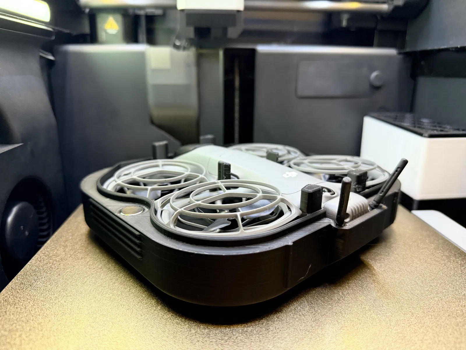 Mình không thích mấy kiểu case cho drone Neo 2 mà mình đã thử, nên tự làm cái của mình luôn. Nếu bạn chỉ cần để cất giữ, mình khuyên mua một cái case đúc khuôn có đệm (kiểu Pelican) tầm $45, để vừa drone và đầy đủ phụ kiện. Cái mình cần là một cái case đủ nhỏ để nhét gọn vô hydration pack, nhưng đồng thời phải chịu được va đập khi té xe đạp. Mình chưa thấy cái nào đáp ứng được yêu cầu thứ 2. Phần lớn case ở đây chỉ là dạng “áo” mỏng, mình bóp bằng tay là nát. Còn cái này, dù in ở chế độ extra draft, bạn đứng lên cũng được. Tất cả vách đều dày 4mm. Mình thấy in PLA+ .20 Standard với 3 walls là cân bằng tốt giữa trọng lượng và độ bền, đồng thời làm cho các gân/đỡ ở giữa được đặc chắc. Case có 6 gối đỡ bên trong để hạn chế bị ép bẹp, trong đó có 2 cái đi xuyên qua chính thân drone. Trên nắp và thân case mỗi bên có 2 lỗ 12mm x 3mm để gắn nam châm khóa. Dung sai khít giúp nắp không bị lỏng lẻo ngay cả khi không gắn nam châm, nhưng nếu thích bạn có thể chà nhám thêm. Mình không muốn dùng khóa gài/ bản lề/ kẹp bên ngoài vì mấy thứ đó lòi ra, hay bị gãy khi in 3D. Case này dùng 2 dây TPU để giữ nắp đóng khi có va đập. Dây cũng giúp tăng bảo vệ và chống trượt. Trên case có các gờ giữ để dây nằm đúng vị trí. Dây chỉ cần trượt vào/ra là xong. Ngoài ra bạn cũng có thể dùng dây velcro, băng keo, dây đai nylon, dây buộc rơm, dây tăng đơ 10,000lb, v.v. Bên trong case vẫn còn chỗ để dán thêm đệm ở nắp và mình có kèm template để cắt lớp lót từ tấm EVA craft foam dày 1–2mm, dù thật ra case không bắt buộc phải có. Có lót vô thì gần như không bị lắc/rung gì luôn. Lưu ý: Lớp lót có thể cần khoét chỗ để tránh bị tì vào nút pin.