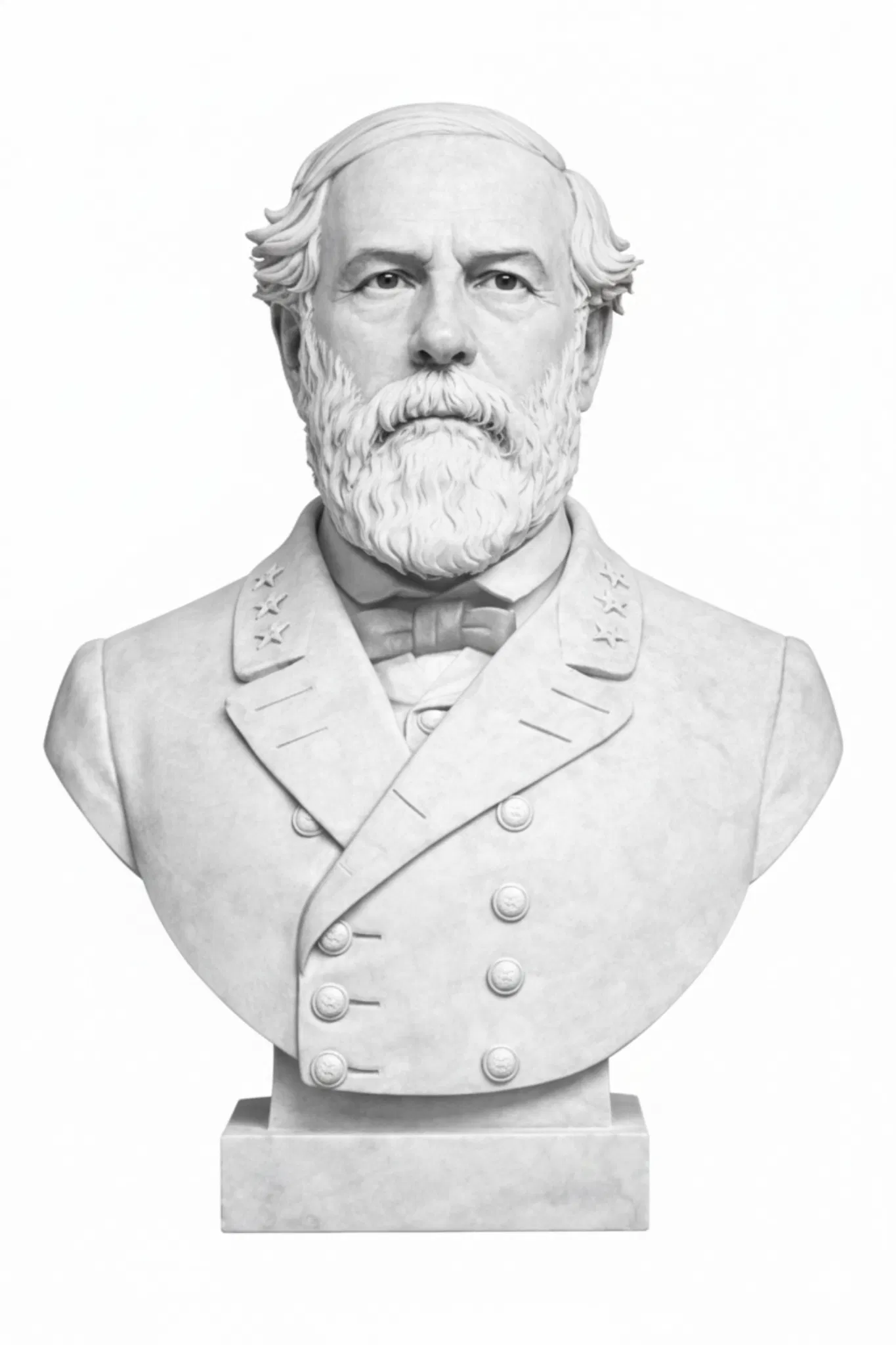 Tượng bán thân phong cách đá cẩm thạch khắc họa Robert Edward Lee (1807–1870). Tạo hình ưu tiên mảng khối rõ, đối xứng tốt và ít chi tiết bề mặt để in 3D dễ ra nét, phù hợp sưu tầm và giáo dục lịch sử.