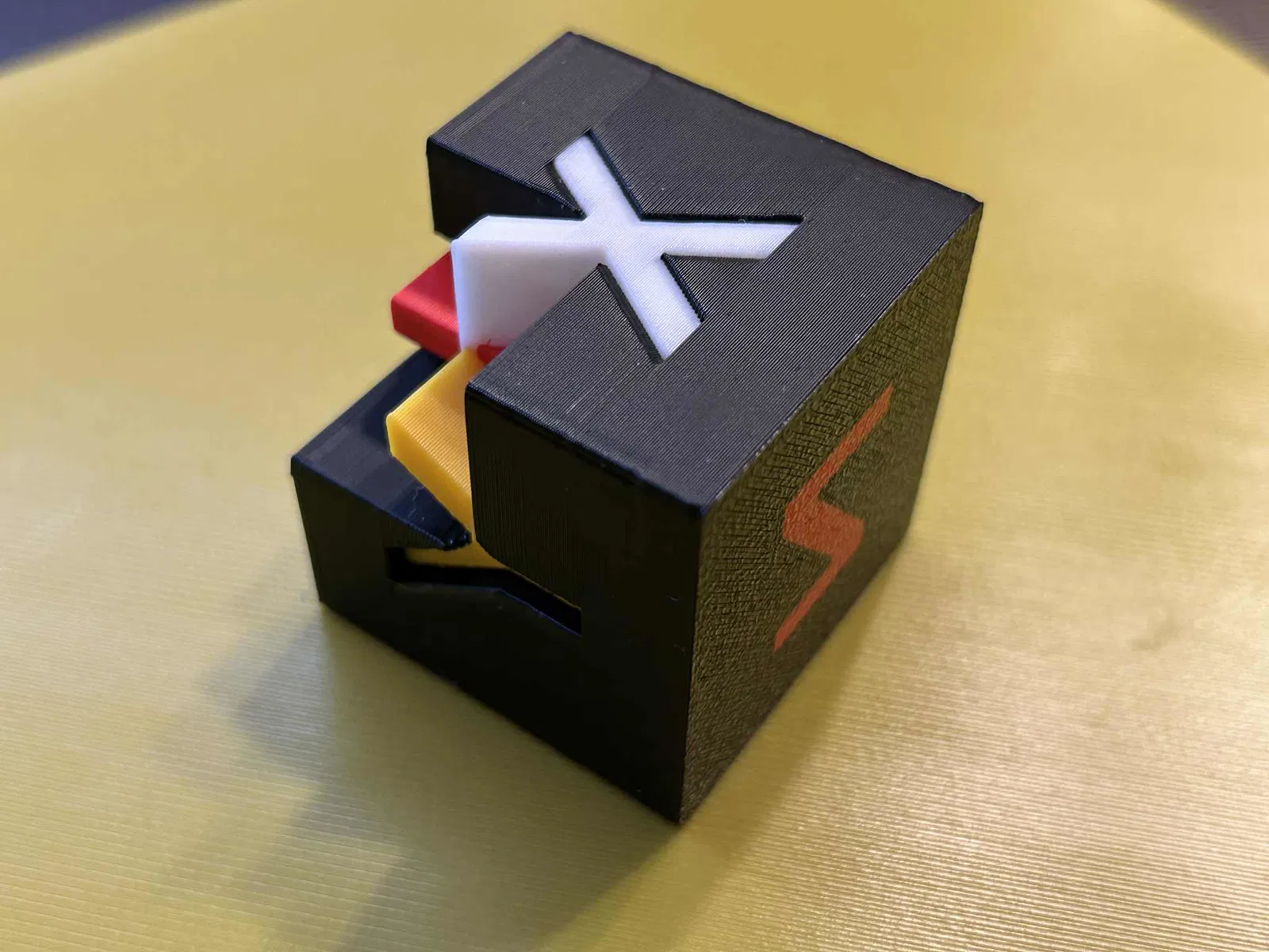 Khối lập phương này gồm 4 khối solid: khối chính là cube 20x20x20mm tạo thành thân. Ba khối còn lại có tiết diện dạng các chữ X, Y và Z. Model được chuẩn bị cho Snapmaker U1 để test in 4 màu. Một phần 1/8 thể tích của cube được cắt đi để lộ ra các khối X, Y, Z giao nhau bên trong.