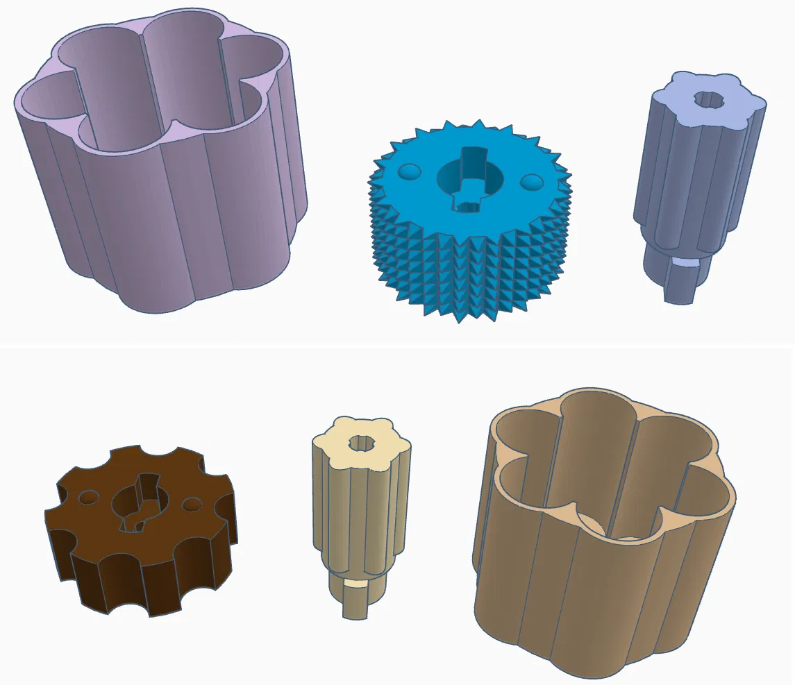 - Thêm bản núm vặn knurled. Cầm bám tay hơn nhiều. Hình minh họa bản in dùng set screw thay vì vít socket head, khác biệt duy nhất trên bản in chỉ là texture của núm vặn.