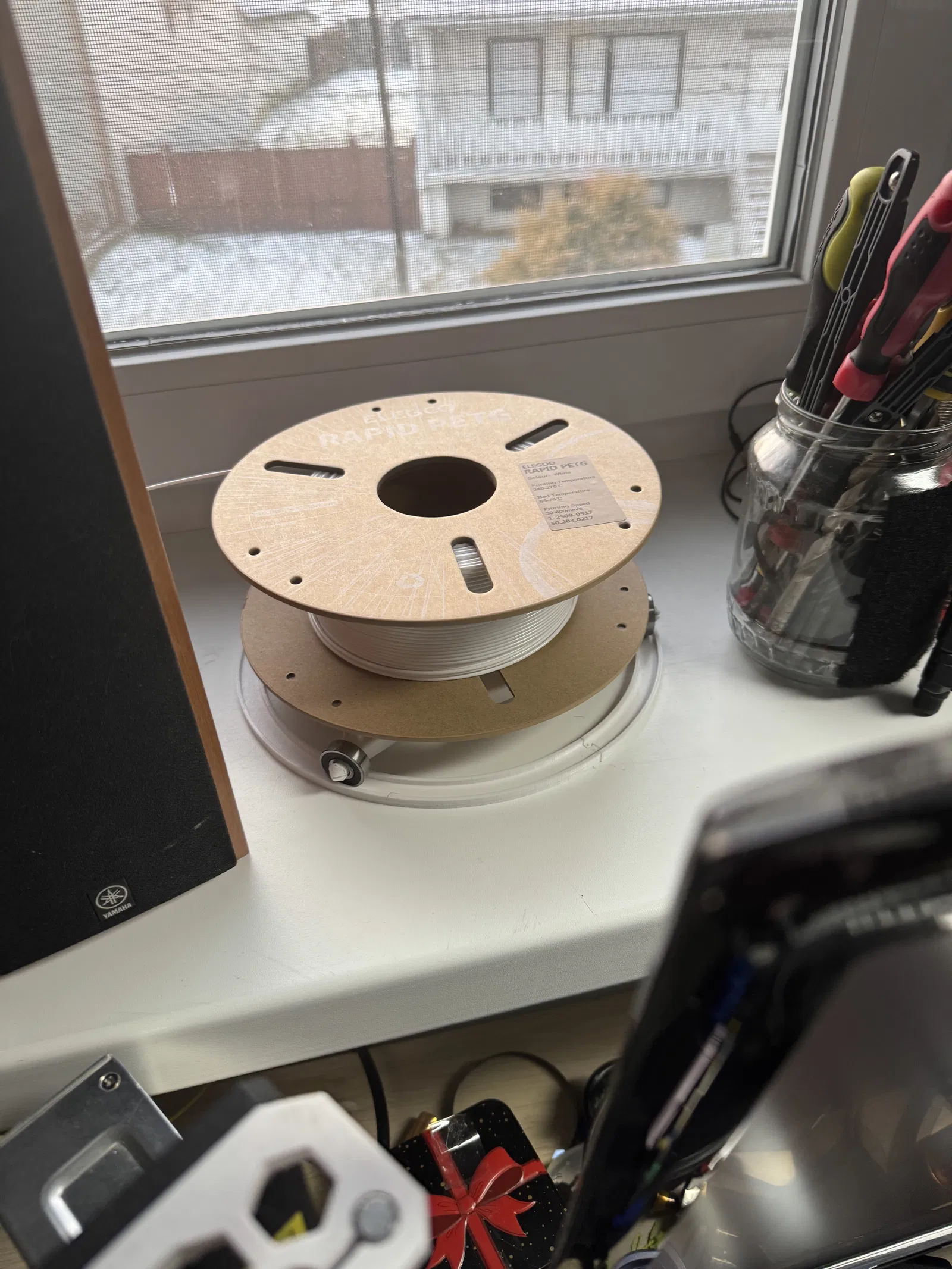 Mẫu giá đỡ filament ngang dễ in, chỉ cần thêm pulley 608 (có thể lấy từ bánh giày patin nên rất rẻ). Nên in bằng vật liệu dẻo hơn PETG để lắp pulley vào khe dễ hơn. Thoải mái chỉnh sửa và gửi ảnh cho tác giả.