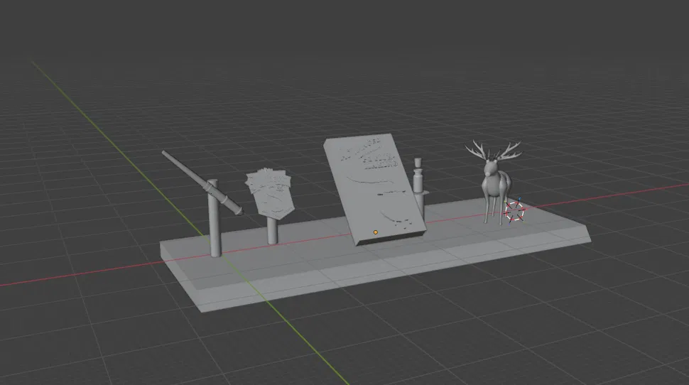 Bộ trưng bày Severus Snape phong cách chân thực: đũa phép, sách _Advanced Potion-Making_, lọ độc dược xanh lục, huy hiệu Slytherin, mặt dây Patronus nai cái và bảng tên khắc “Severus Snape”.
