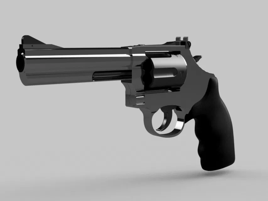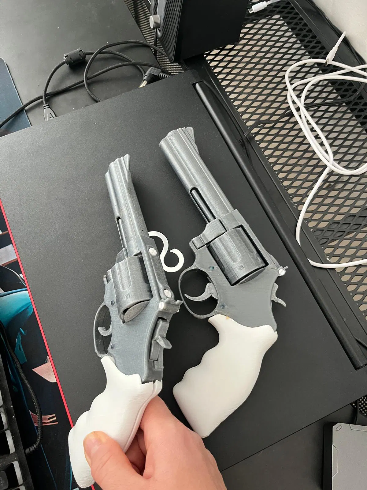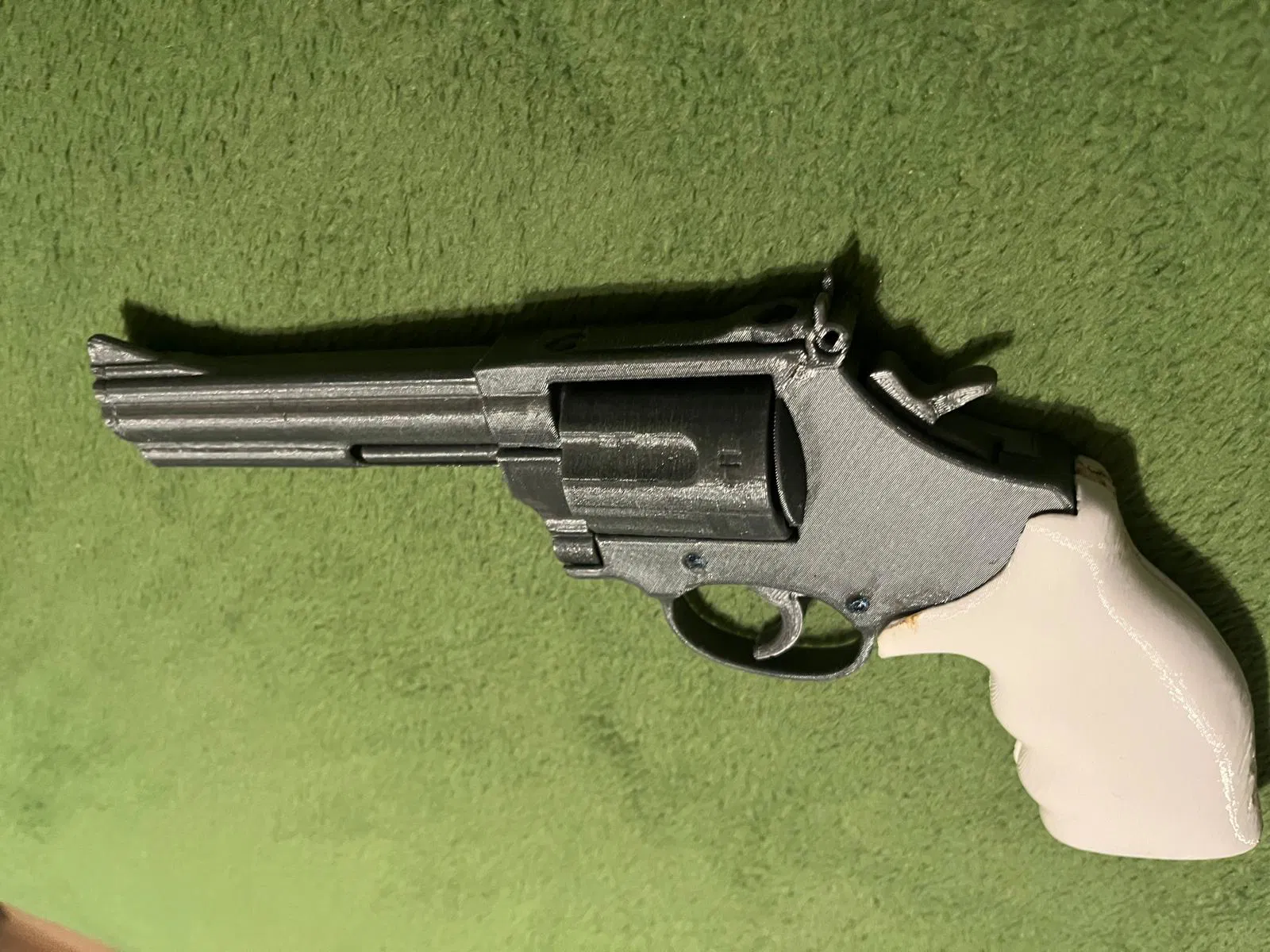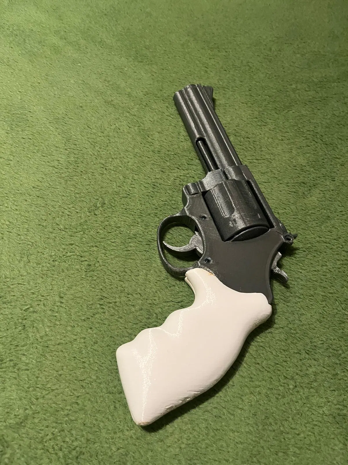 Mẫu Revolver Smith&Wesson 686 bản gốc, tỉ lệ 1:1. Tác giả in bằng Prusa MK3s+ nozzle 0.4mm, dùng PETG bạc/trắng (gợi ý PLA có thể tốt hơn) và chỉ cần tree supports cho vài part.