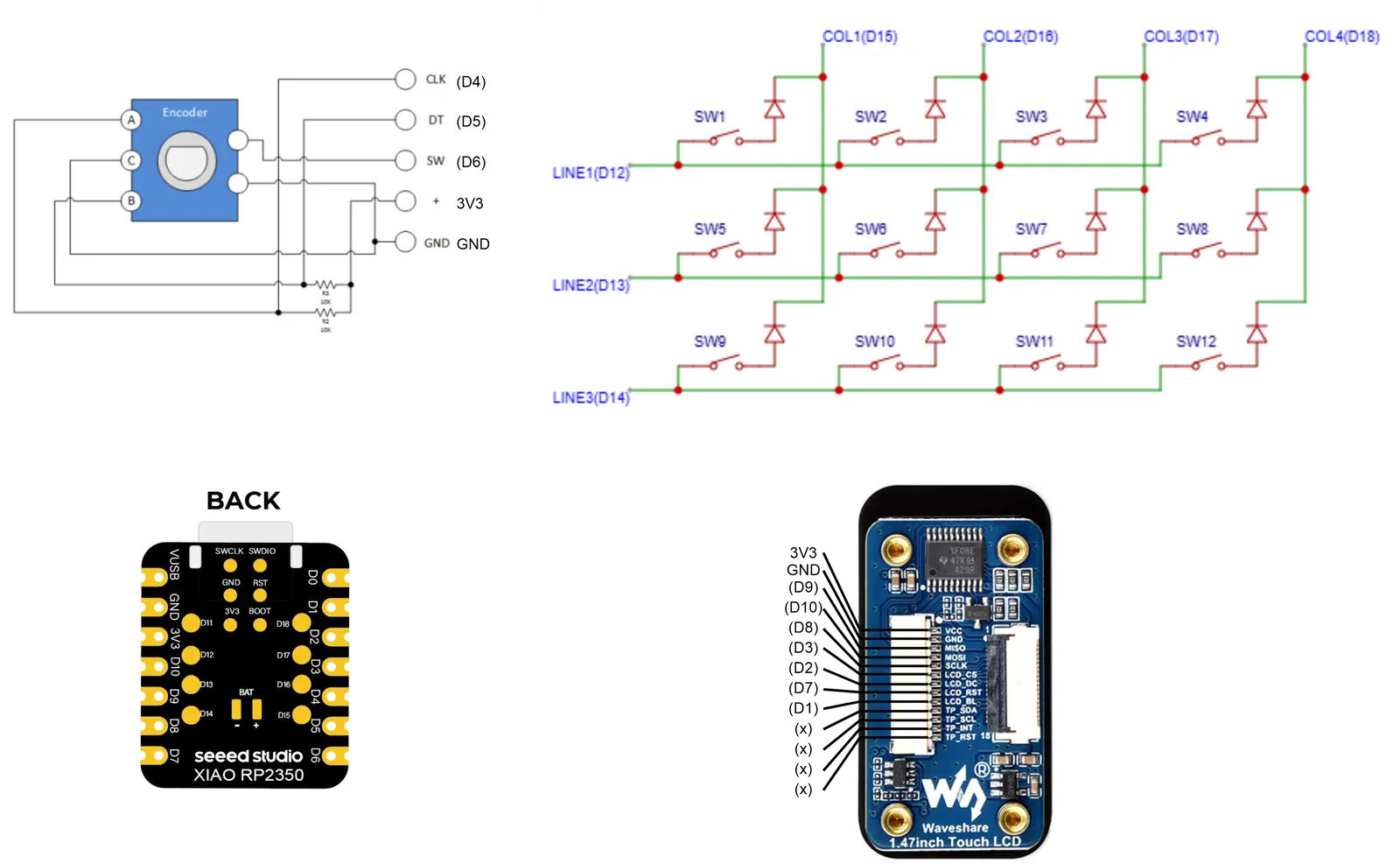 Macropad 12 phím tuỳ biến dùng Seeed Studio Xiao RP2350, có rotary encoder và màn hình Waveshare LCD 1.47". Vỏ in 3D (FDM), keycaps in SLA, firmware CircuitPython; đi dây hand-wired nên khá khó ráp.